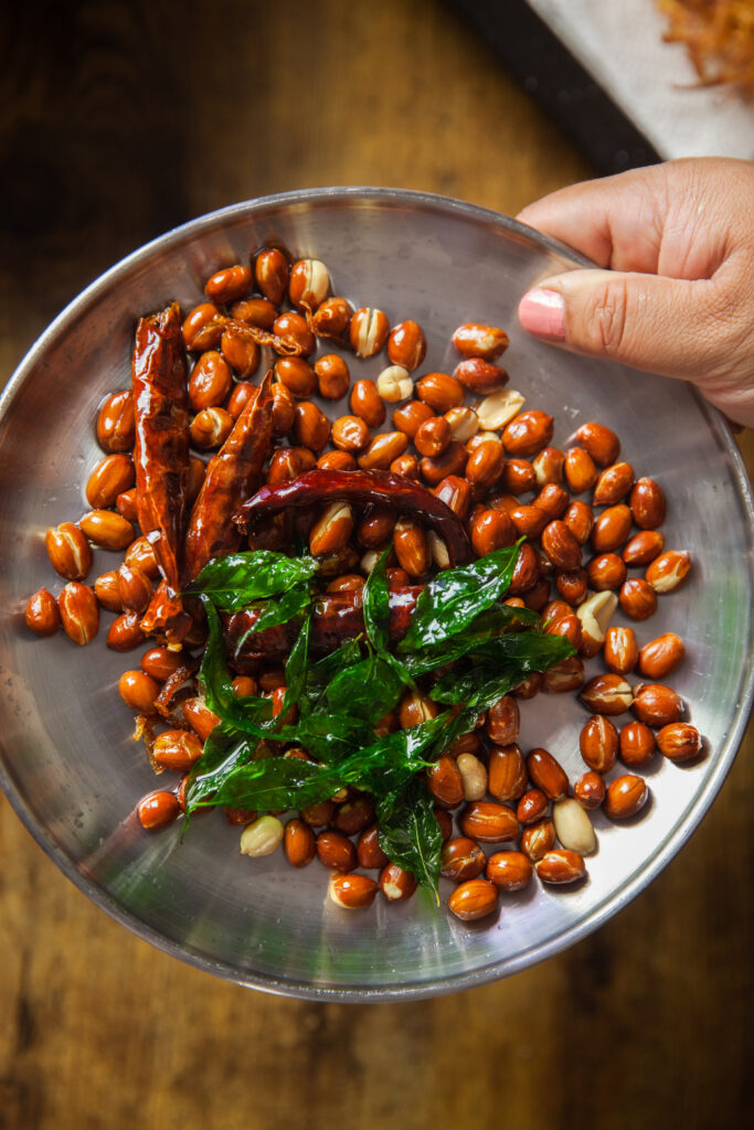 - In the same oil fry peanuts and cashews (if using raw), curry leaves and dried red chilli.