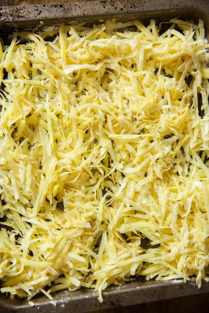- Drain and spread the grated potatoes on a cloth/kitchen towel. Pat them dry completely.