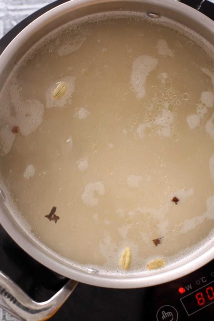 - On the stove, place a large pot capable of holding 10 cups of water. Add salt, ghee, lemon juice, and whole spices to the water. Bring the water to a rolling boil over high heat.