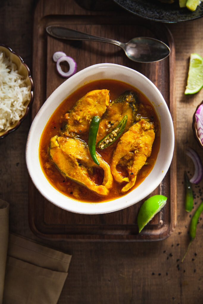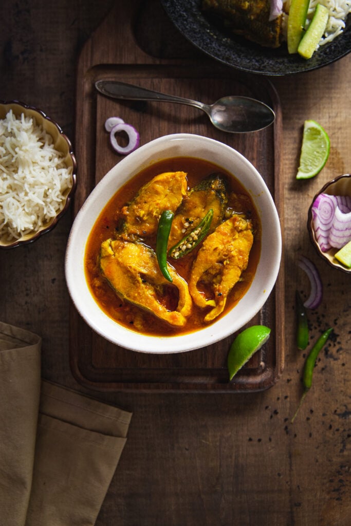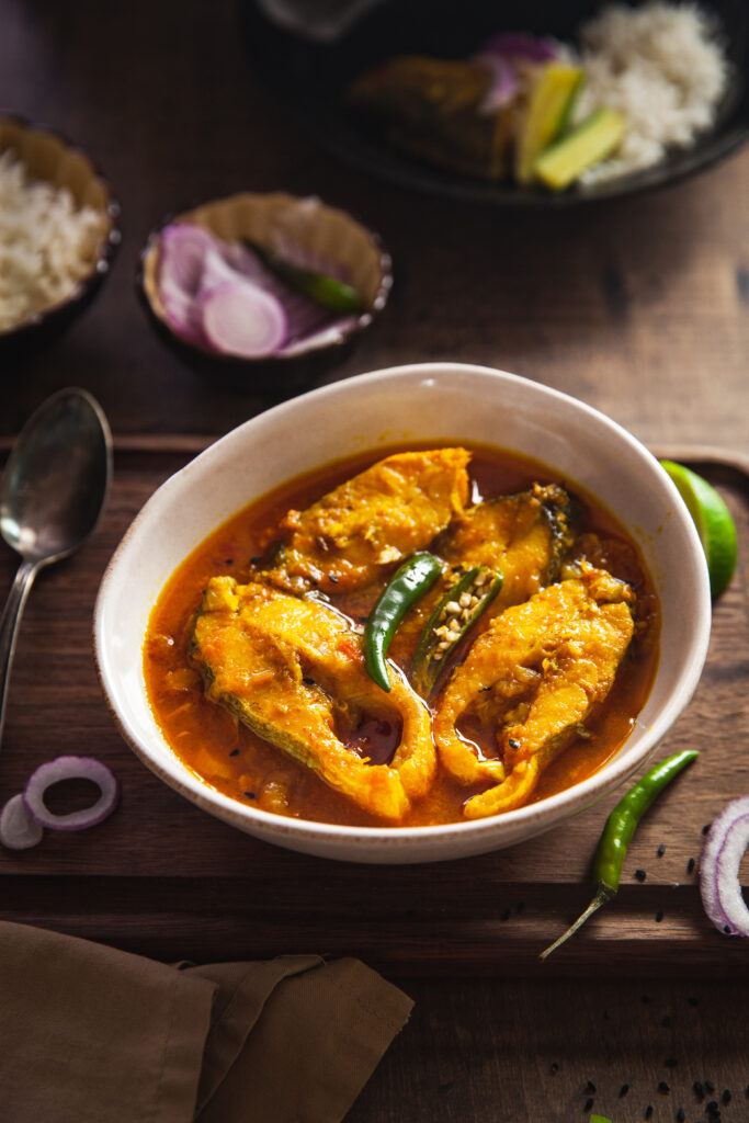 Bengali Macher Jhol.A light spicy fish curry perfect for summer months. For us indians, curries are year round, isn't? Depending on the season, I switch between lighter or richer preparations and these days I am mostly making soupy tomato or yogurt based ones.