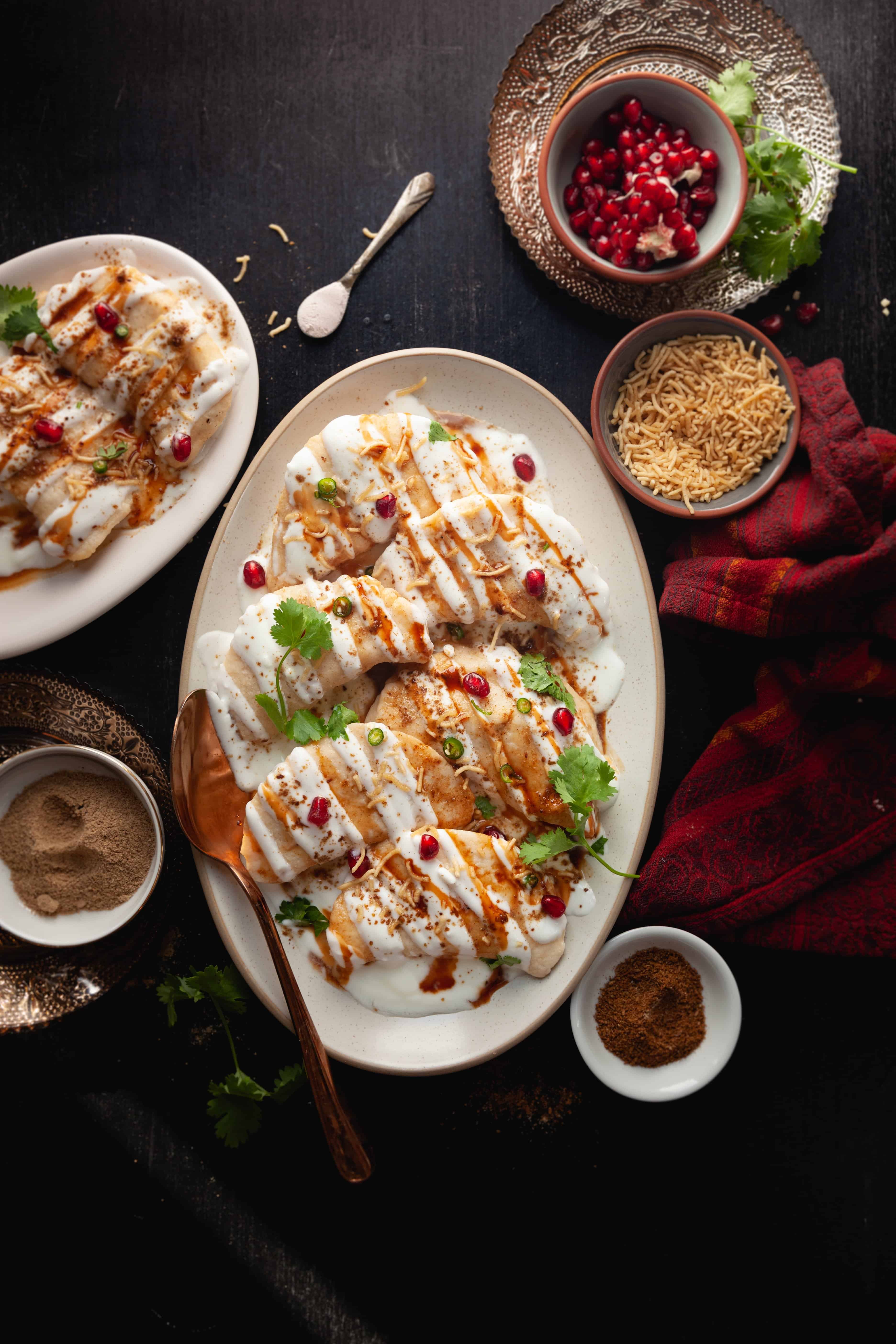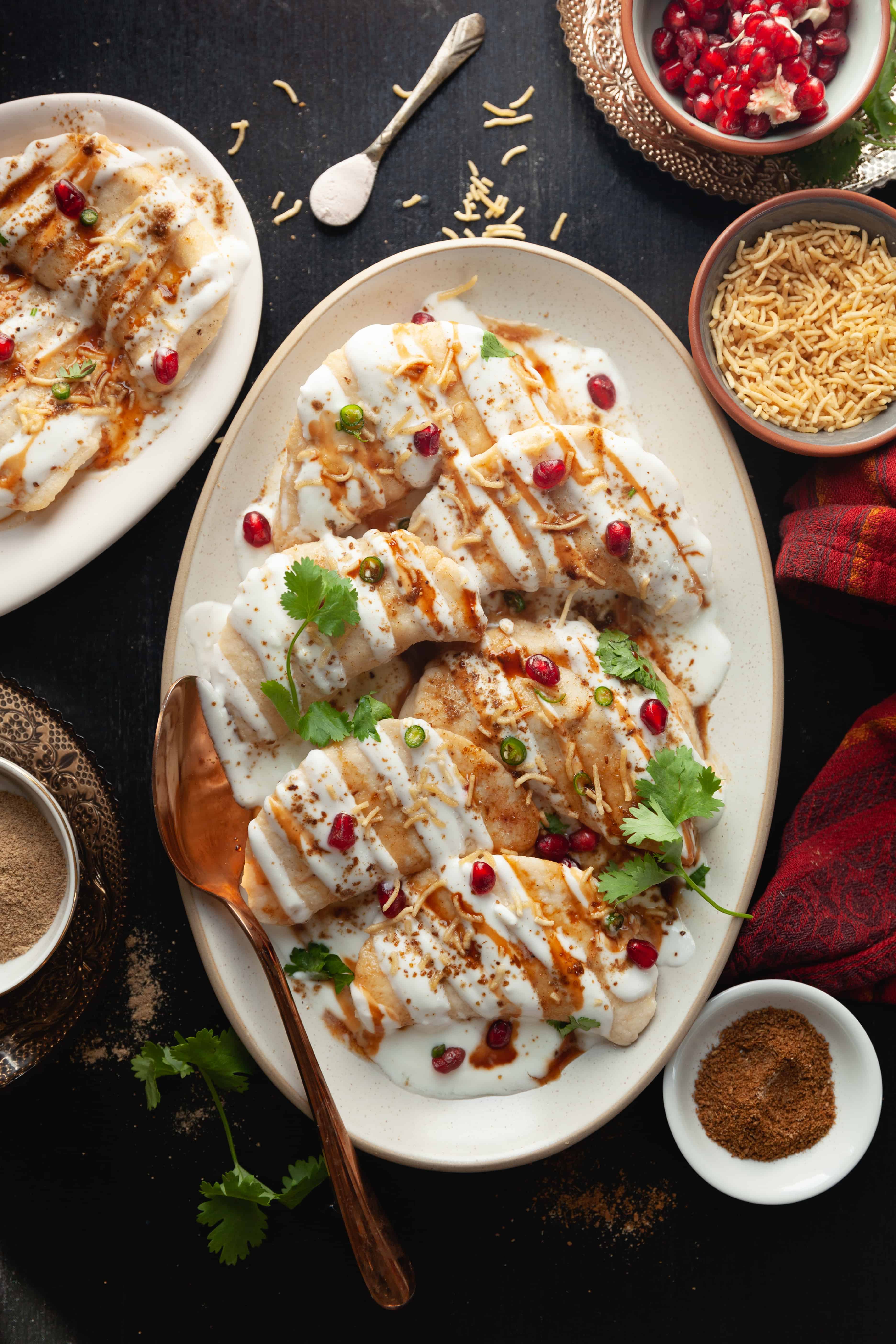 - In a dish, add about ¾ cup of yogurt that we made. Layer the chilled gujiyas in a single layer. Pour another ¾ cup of yogurt on top. Reserve the remaining yogurt for when serving. Chill everything in the fridge for 3-4 hours.Serve the chilled gujiyas as you wish with extra yogurt and chaat toppings.