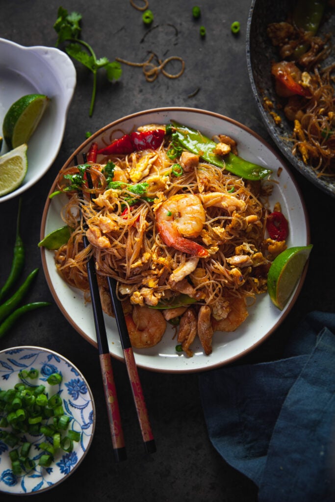 The traditional version uses char siu pork(BBQ pork) but I use eggs, chicken & shrimp. You can skip or add any kind of protein your family likes. This is a super weeknight friendly recipe. For the vegetables I use snap peas and red bell pepper, however bean sprouts and bok choy can be used as well. Like any asian or indo chinese recipe, these do need you to prepare the ingredients before hand- chopping the vegetables, preparing the protein, softening the rice sticks etc , I would say about 20-25 minutes worth of preparation, but once you are done, from there these noodles come together in hardly 6-8 minutes.