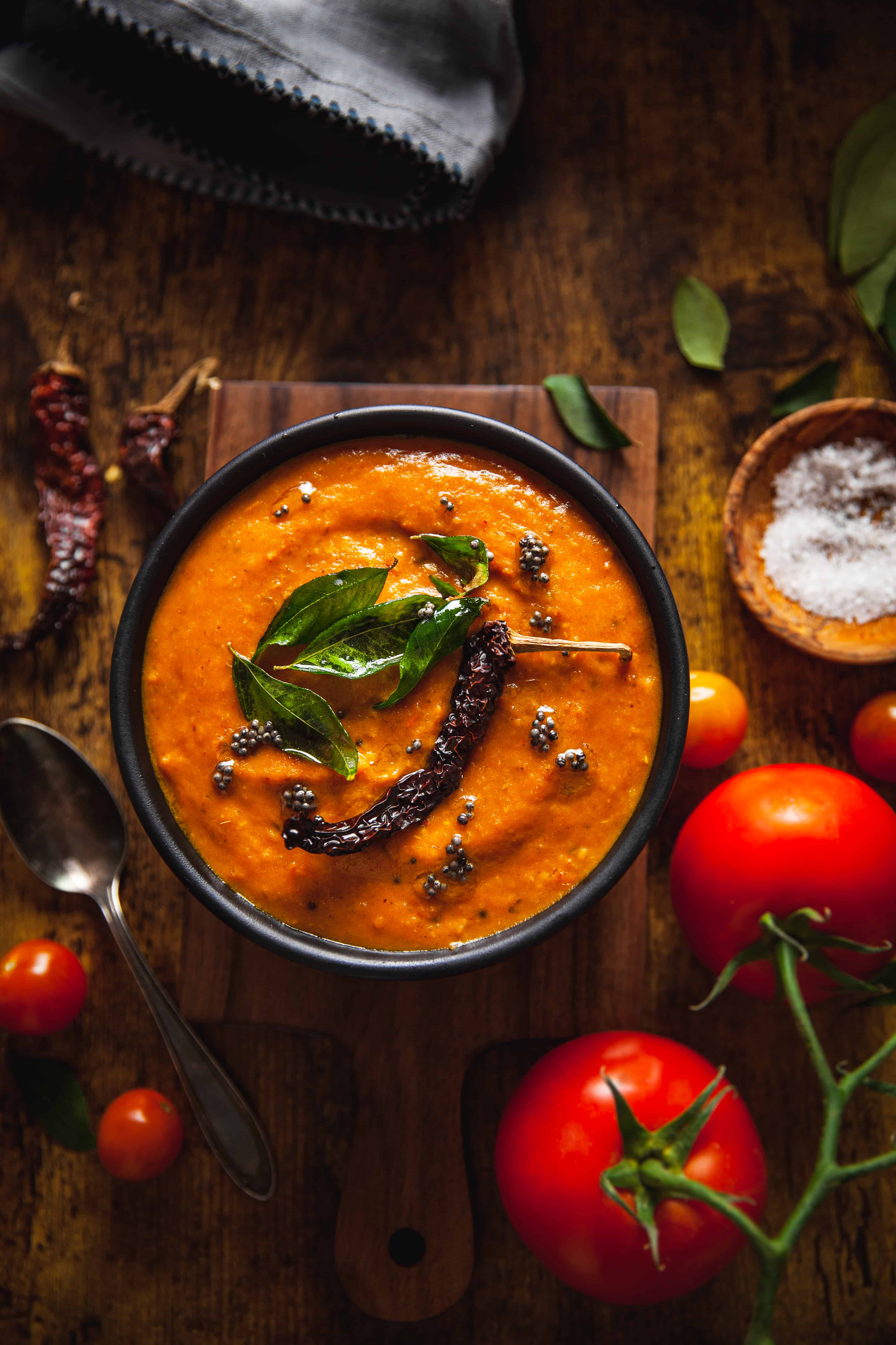 - In the same pan, add ½ tablespoon oil and temper the oil with mustard & fenugreek seeds. Let crackle, add a pinch of hing and add the curry leaves. Once the curry leaves are crisped, add the tomato paste and cook everything for 3-4 minutes untill its saucy.