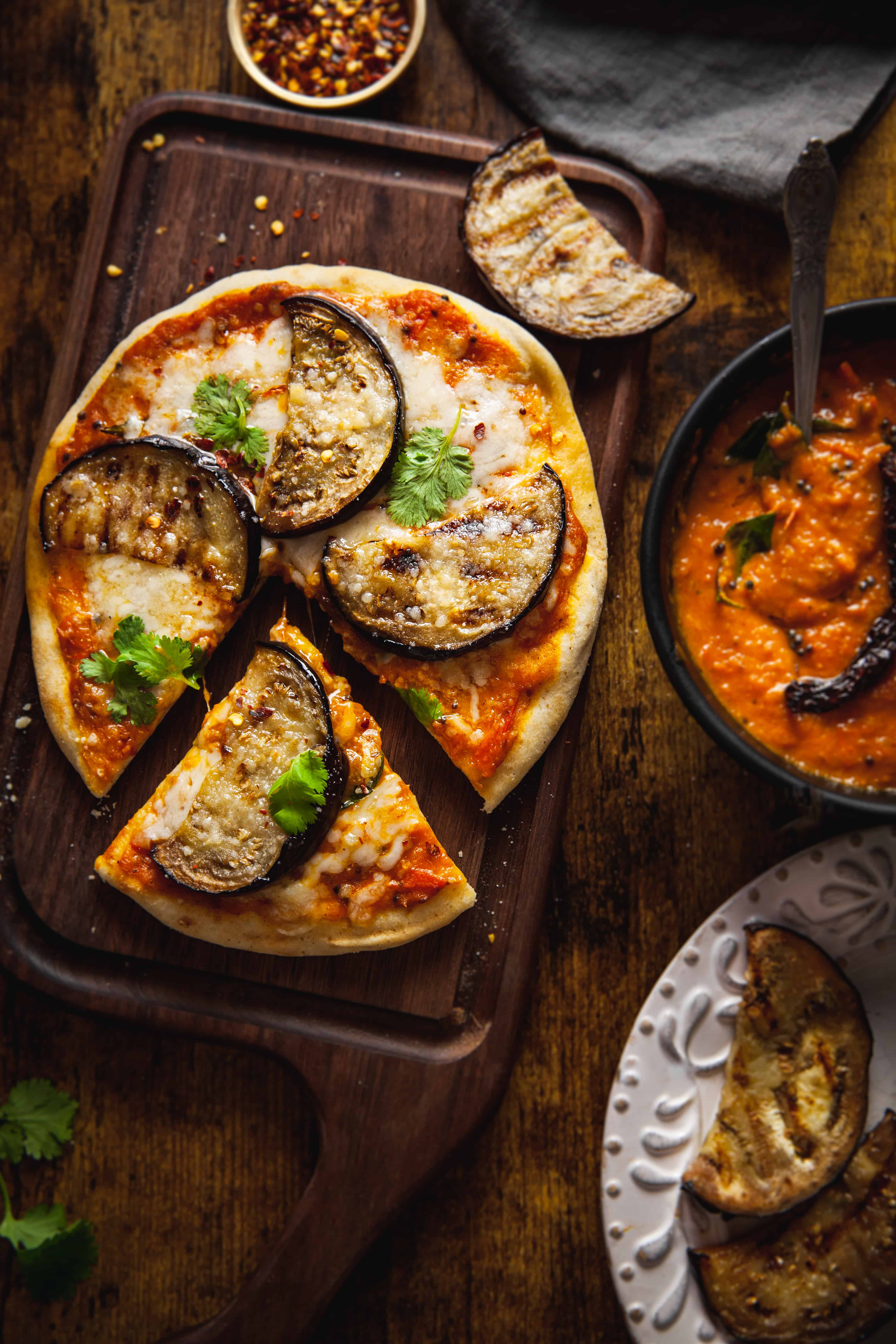 I am a huge fan of vegetarian pizzas and you can say that this recipe combines the east & west. A robust spicy and tangy tomato chutney is used as a sauce on which I layer grilled eggplant slices, sprinkle parmesan and the flash bake it till the eggplant is just tender, still spongy and juicy to bite into. An amazing fusion recipe which is on repeat all summer in my kitchen since tomatoes and eggplant bounty is at its peak during this time.