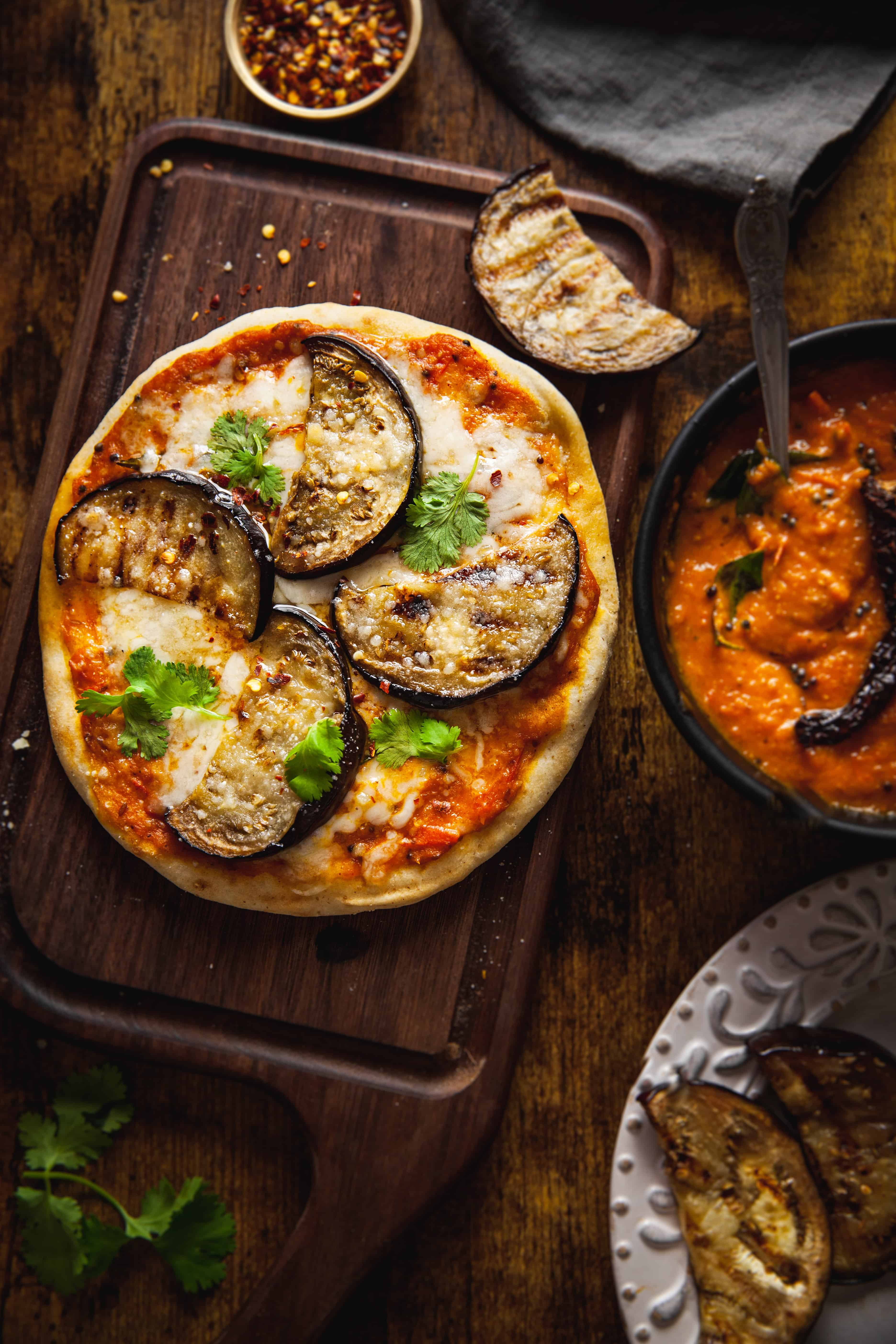 - Assemble the pizza- Place the pizza base on a pizza stone or place on a cookie sheet lined with a rack. Spread the 1-2 tablespoon tomato chutney on top of the pizza bases, add shredded mozarella cheese. Layer eggplant slices. Sprinkle parmesan cheese. You can add a drizzle of oil at this stage as well.