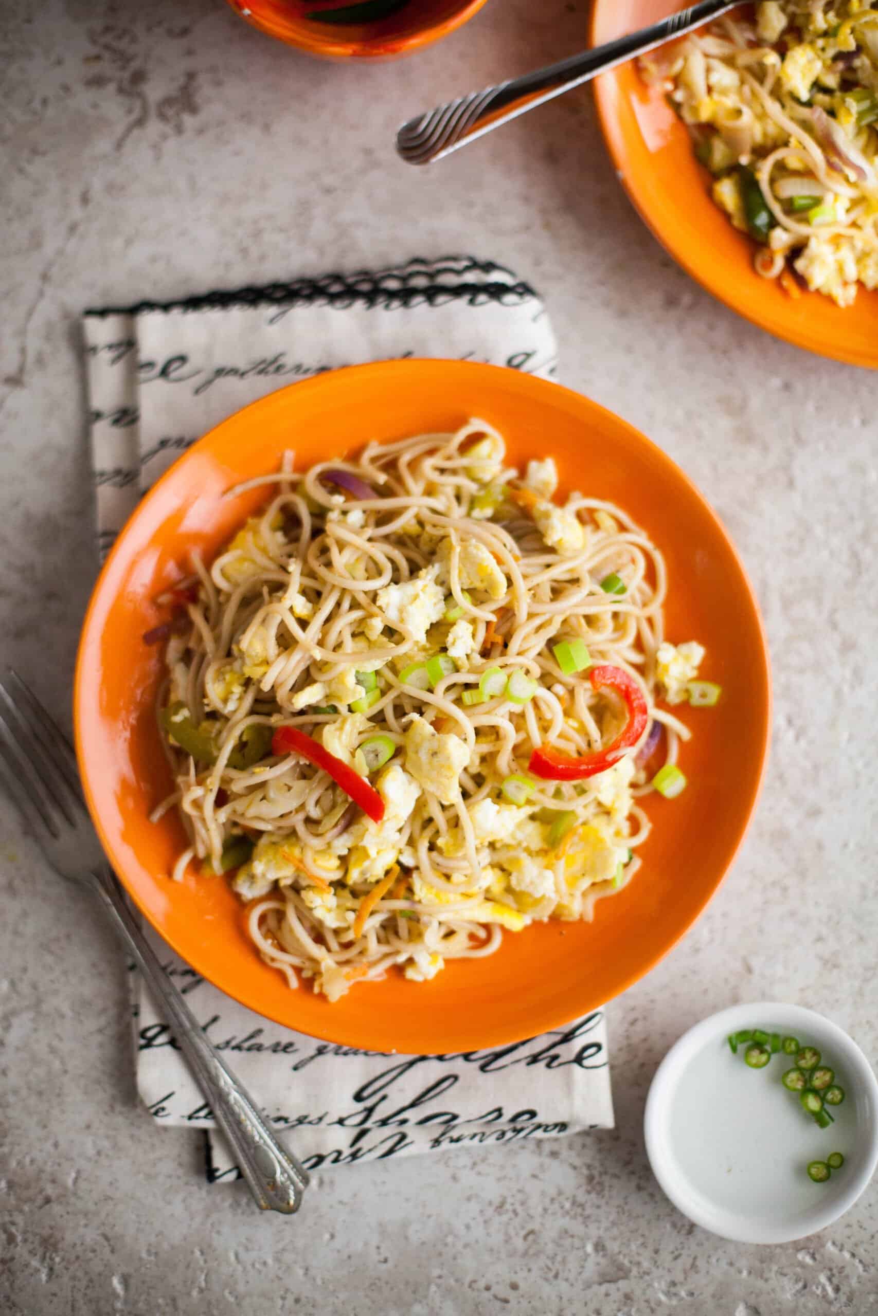 - Check the salt and adjust. Let cook for 1-2 minutes till the noodles are just warmed through. Switch off the stove Add vinegar and the cooked eggs.