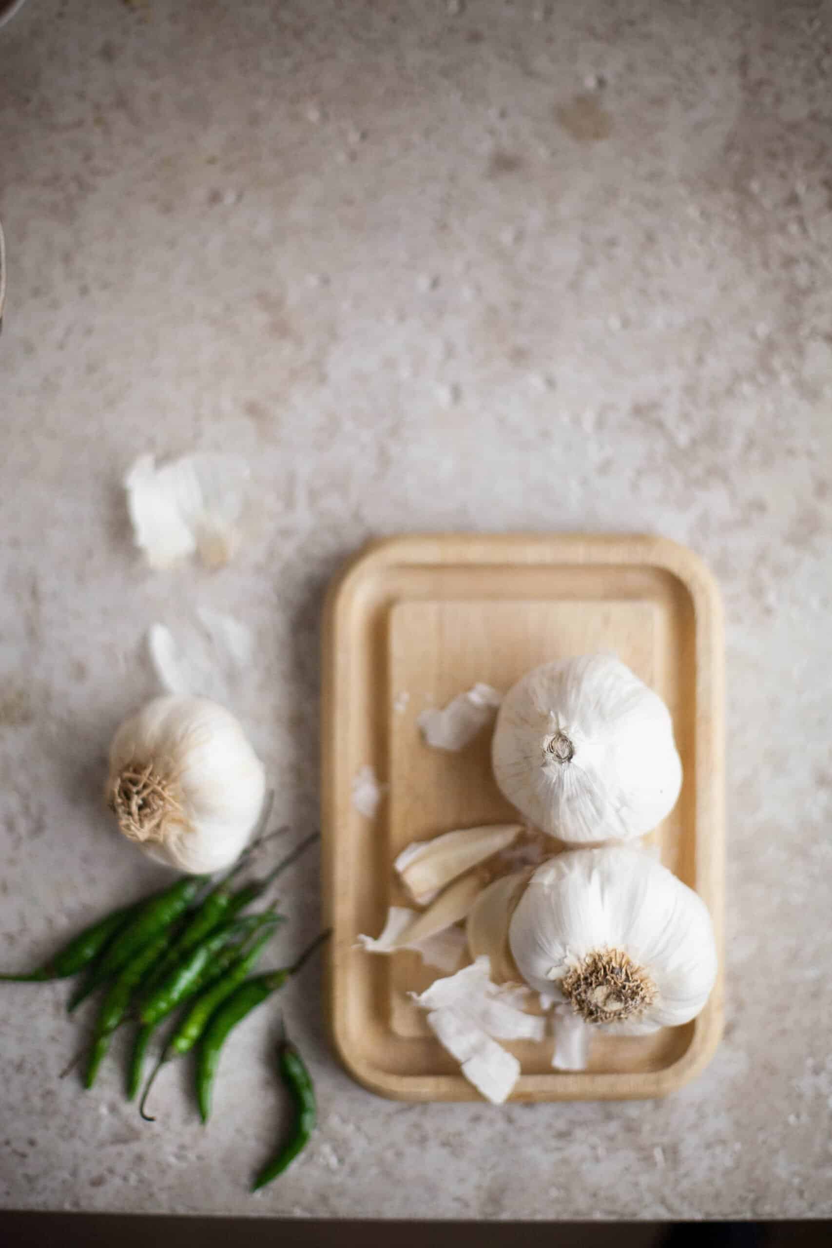 - While the noodles are cooking, you can prepare the vegetables. Using your mortar & pestle pound the garlic into a coarse paste. Slit and half the green chilies or finely chop them depending on the heat level you prefer. You could seed them if you like.
