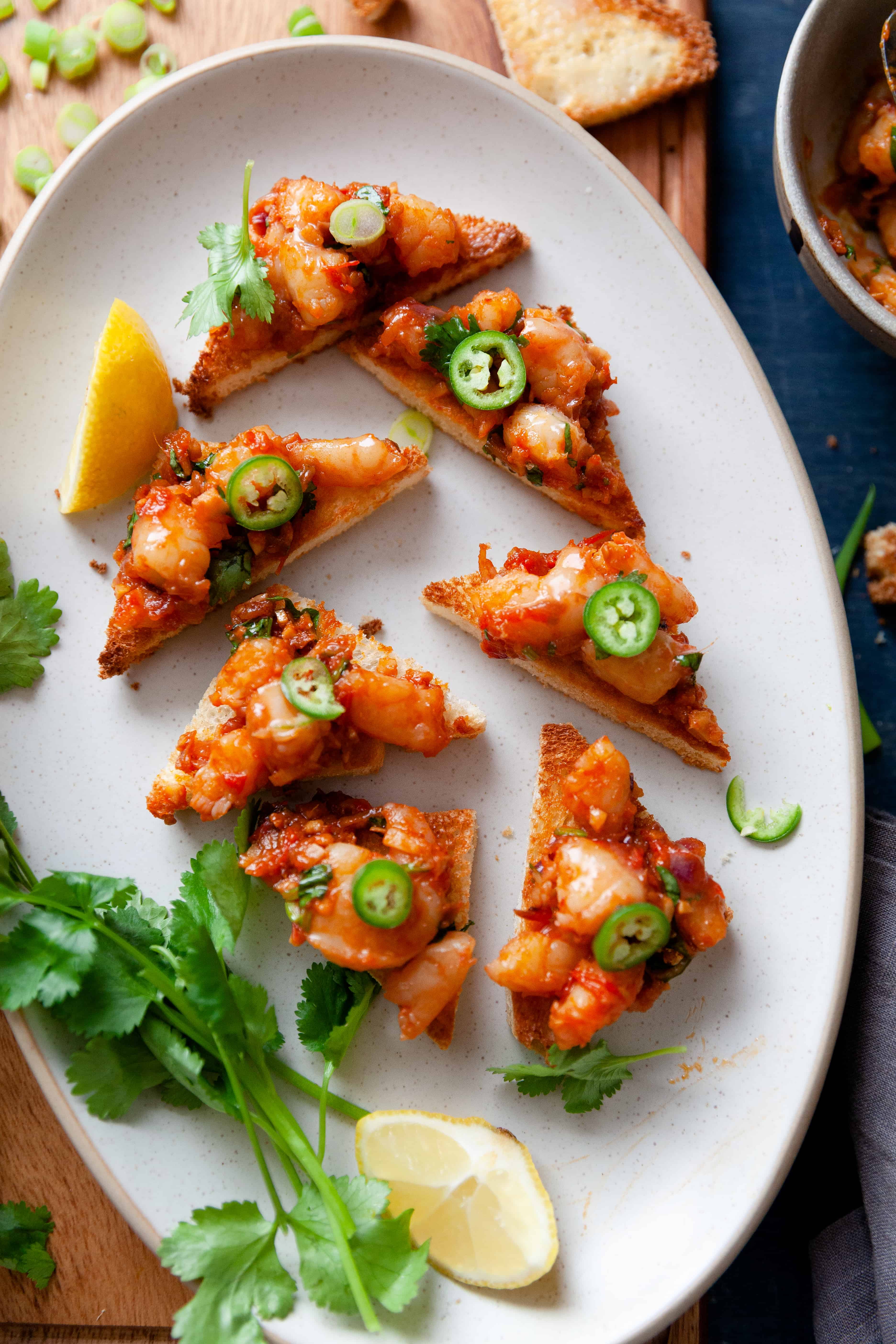 Indian Shrimp Toast. Buttery bread topped with a quick fiery indian masala shrimp. A simple yet elegant appetizer. These toasts are so wonderful with some drinks for entertaining. They are just delicious with a blast of textures - crisp bread, succulent shrimp and fiery bite of green chillies.