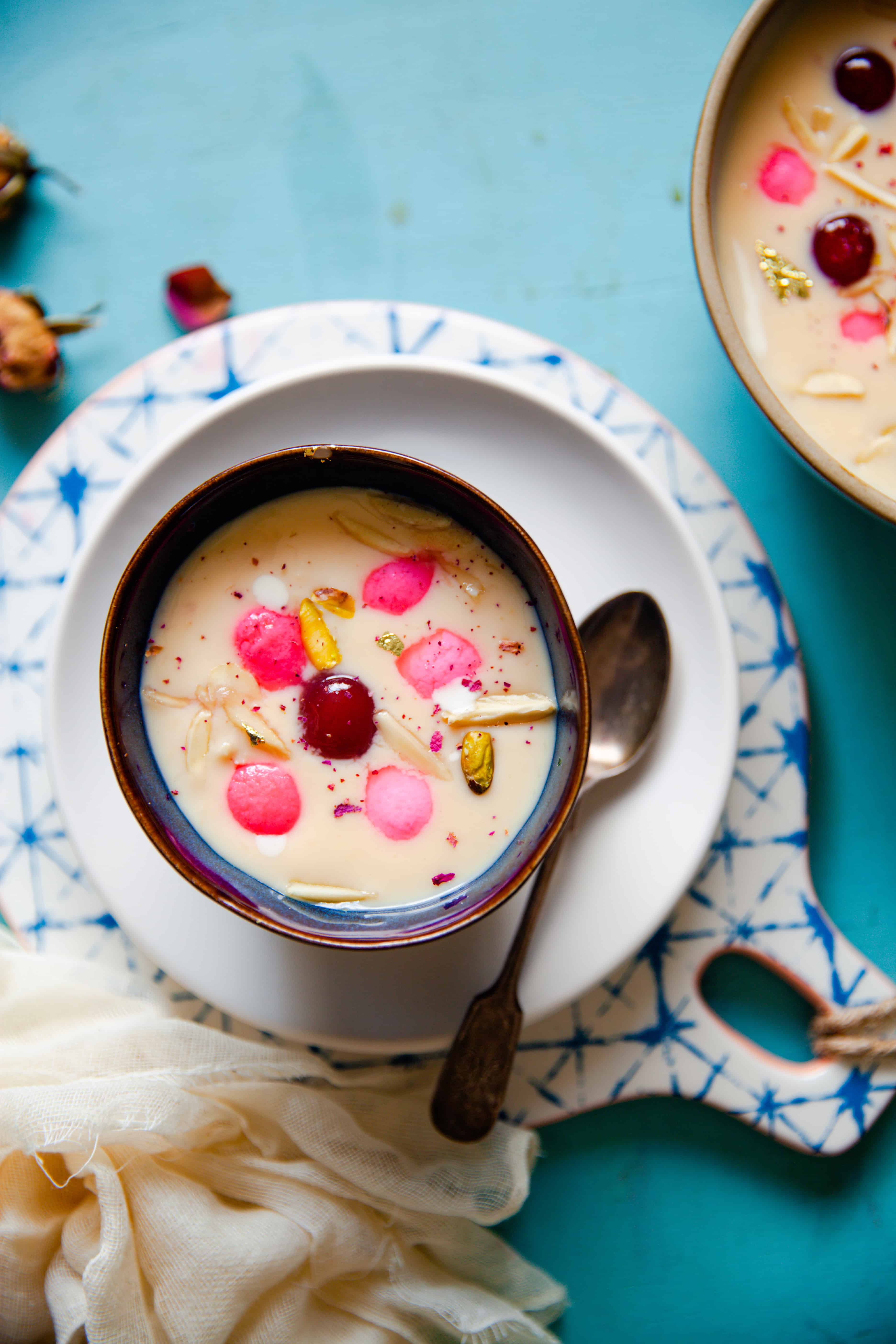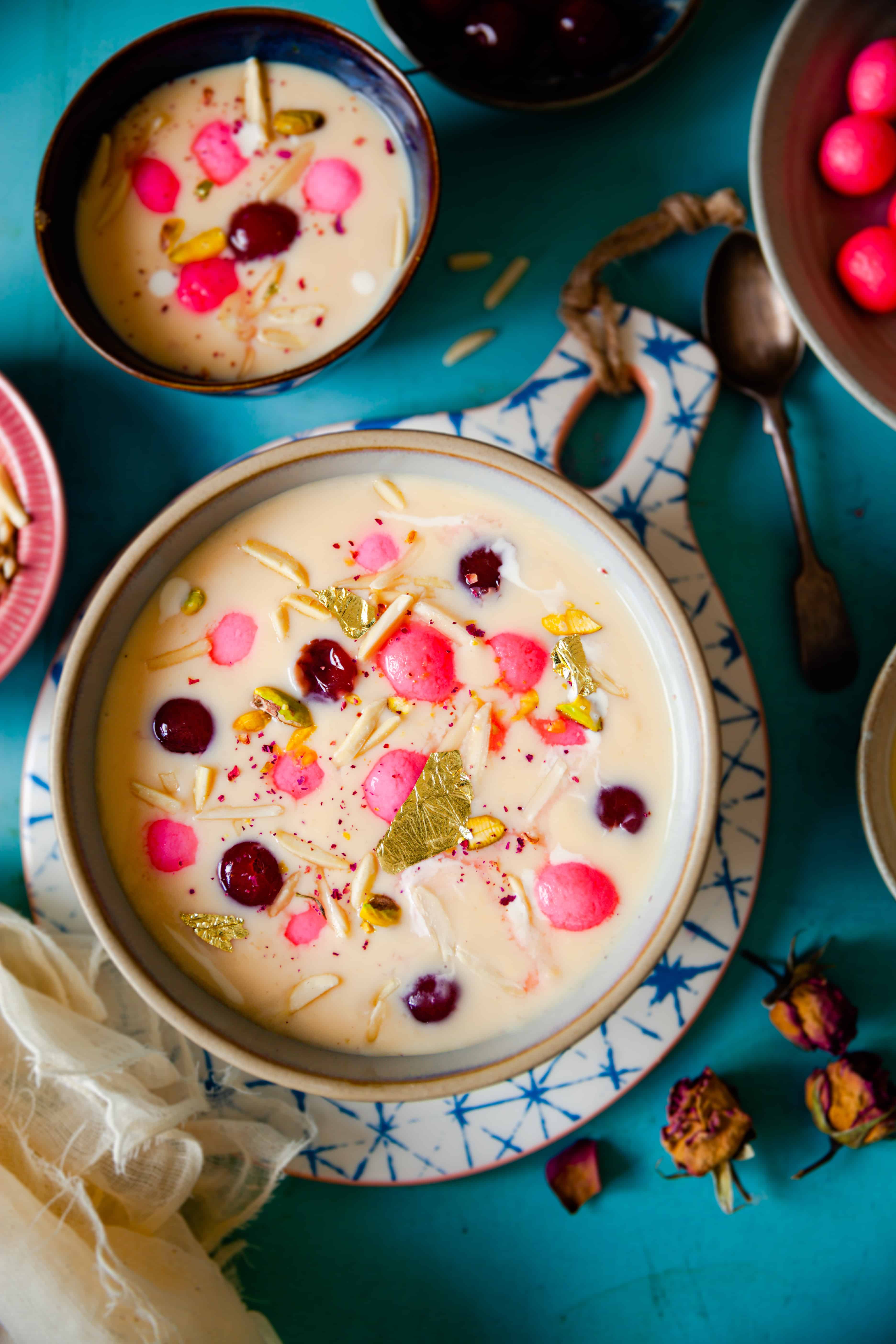 - Transfer the custard to a wide dish. Squeeeze the syrup from the chenna balls and add it to custard. Add drained cherries and nuts. Add rose crushed rose petals and some edible gold film to decorate. Serve chilled.You can serve individual servings as well following the same steps.