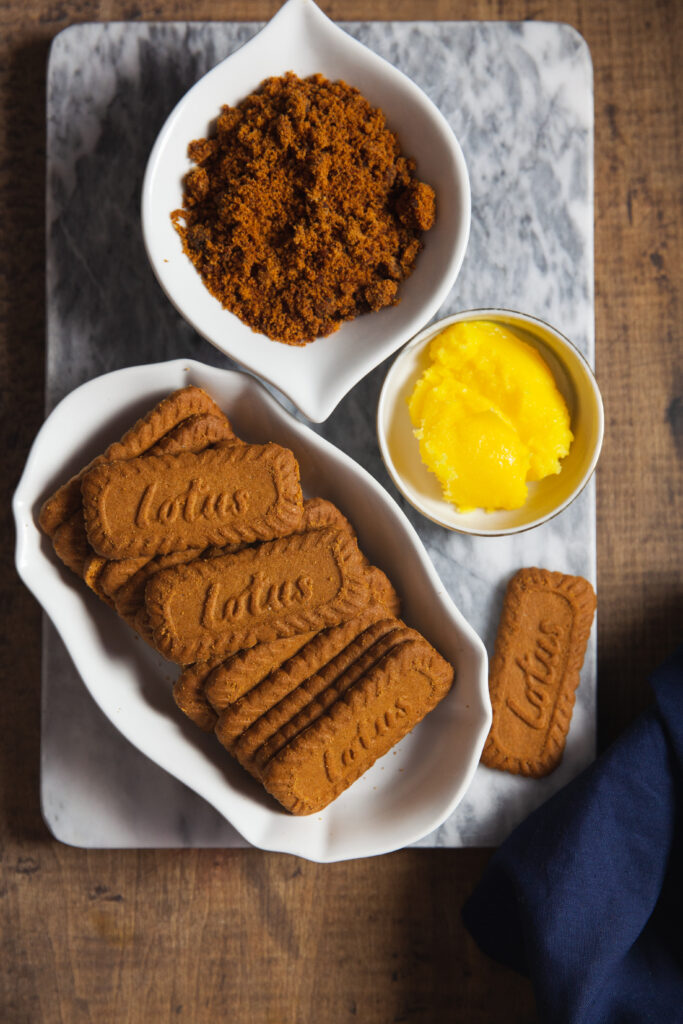 - Place biscoff cookies,sugar and jaggery in a food processor fitted with a metal blade. Whiz to crumbs. Add ghee and pulse to combine. Press the cookie crumbs to the base of prepared pan. Keep ready.