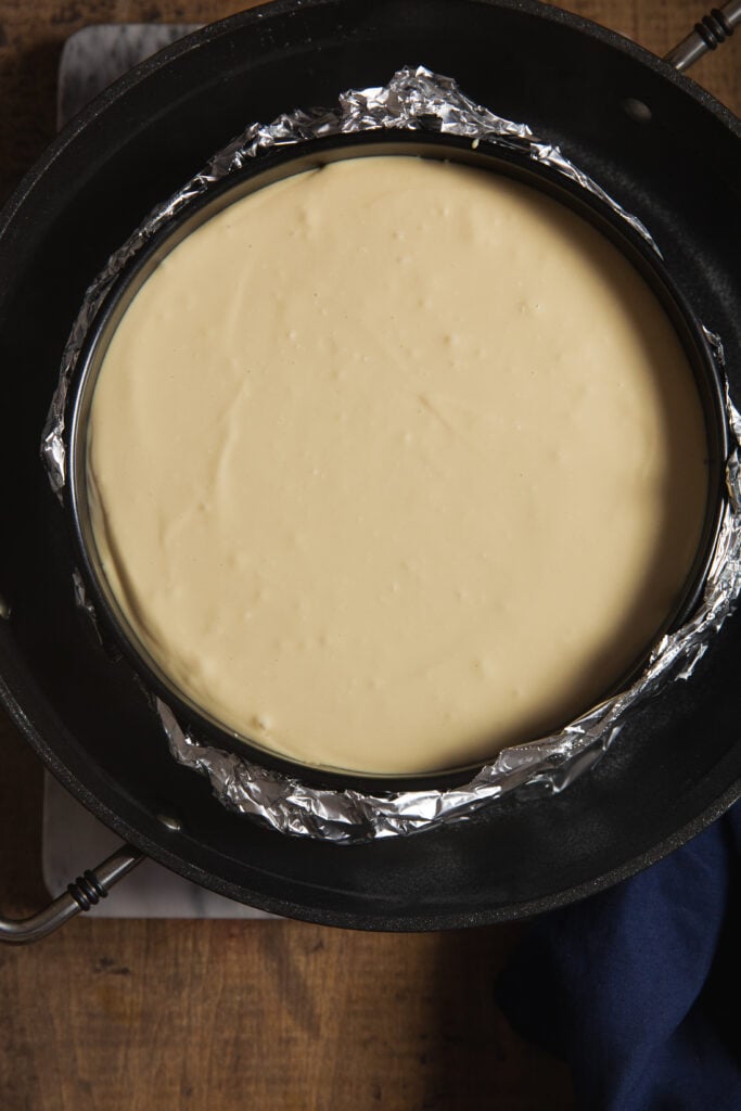 To prevent a soggy crust, it is a good idea to wrap the cake pan in 3-4 layers of aluminum foil. Baking the cheesecake in a water bath will help in slow baking of the cheese layer reducing the possibility of cracks and unevenly baked areas. In a nut shell, water bath prevents drastic temperature changes while the cheesecake bakes. After the cheesecake is finished baking, water bath additionally helps in slow cooling hence preventing the temperature of the cheesecake to drop drastically once the oven is off. This prevents cracks and the possibility of shrinkage of edges and the top surface is reduced as well.