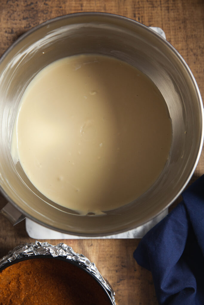As with every cheesecake, the process of making this cake starts with the crust. I start by crushing the biscoff cookies. You can add little cinnamon while crushing the cookies as well if you like them extra spiced. It is important to crush the cookies such that there are no big pieces. I find pulsing in a food processor better than hand crushing in a Ziploc bag.To make the cheese filling, simply start by beating the softened cream cheese on medium speed until smooth. Next we add the jaggery followed by sour cream and heavy cream. Then the eggs go in one by one and the filling is mixed just so that its smooth and lump free. The cream cheese filling is then poured over the cookie crust. The cake is then baked in a water bath.