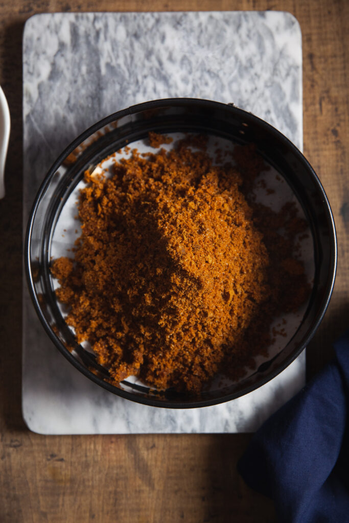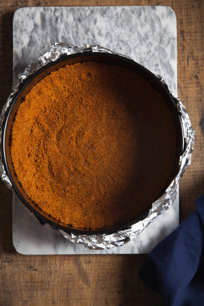 - Biscoff Cookie Crust :- I used 20-25 biscoff cookies and melted ghee, and sweetened them with a tablespoon each of sugar & jaggery for the crust. You can use digestive biscuits, ginger snaps or graham crackers as well for the crust.