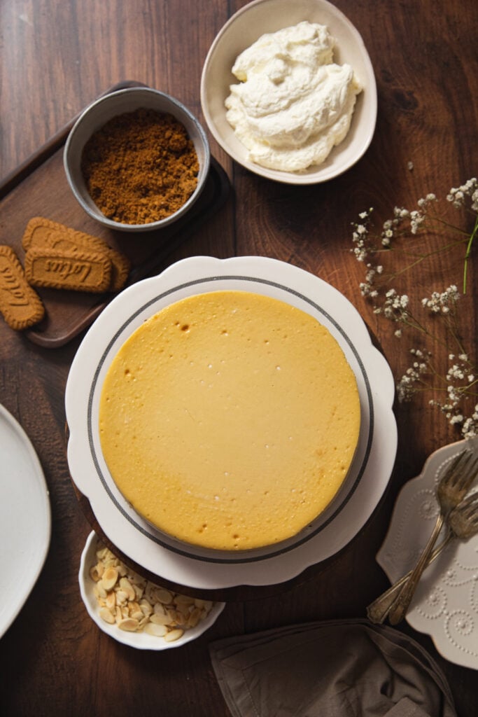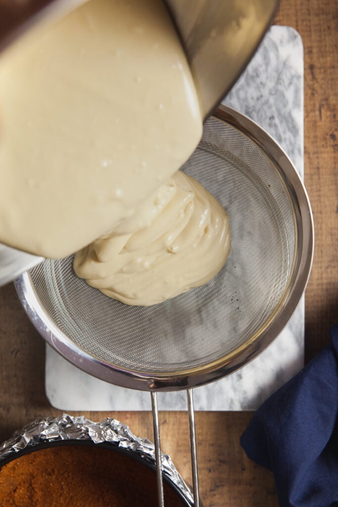 When mixing the filling, you have to make sure to not overmix the filling. Stick to exact timings that I have noted down in the recipe. Overmixing incorporates air. The air bubbles pop during baking and create cracks. Also, I recommend you to strain the filling after mixing it. It is an additional step but trust me it really makes sure that the filling is super smooth.