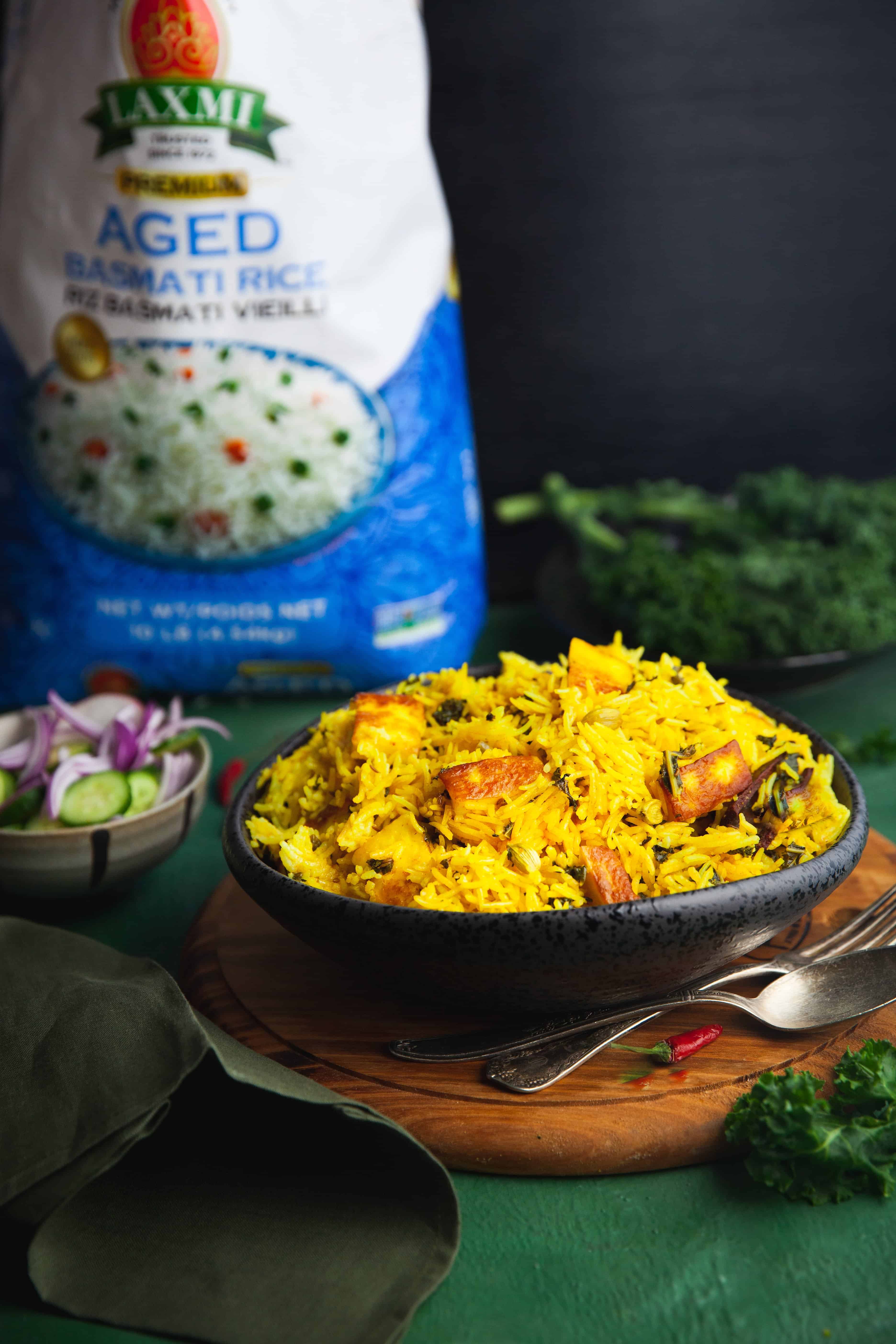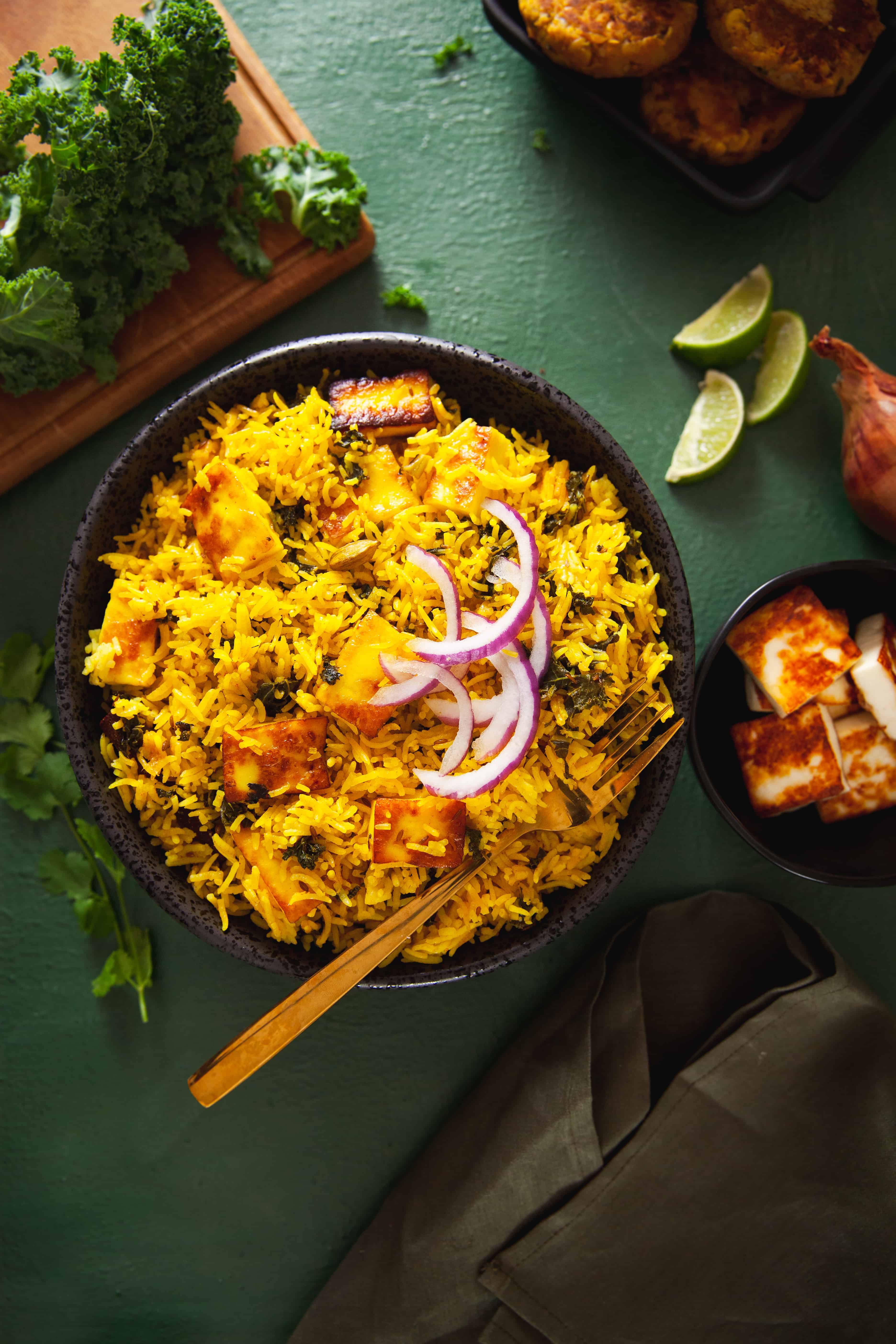 A fragrant and easy paneer(indian cheese) and kale pulao that is perfect for lunchboxes and quick meals.It tastes great a room temperature and keeps well for 2-3 days without changing its taste.Serve it on its own with salad, papad and raita or combine with tikkis or kebabs.