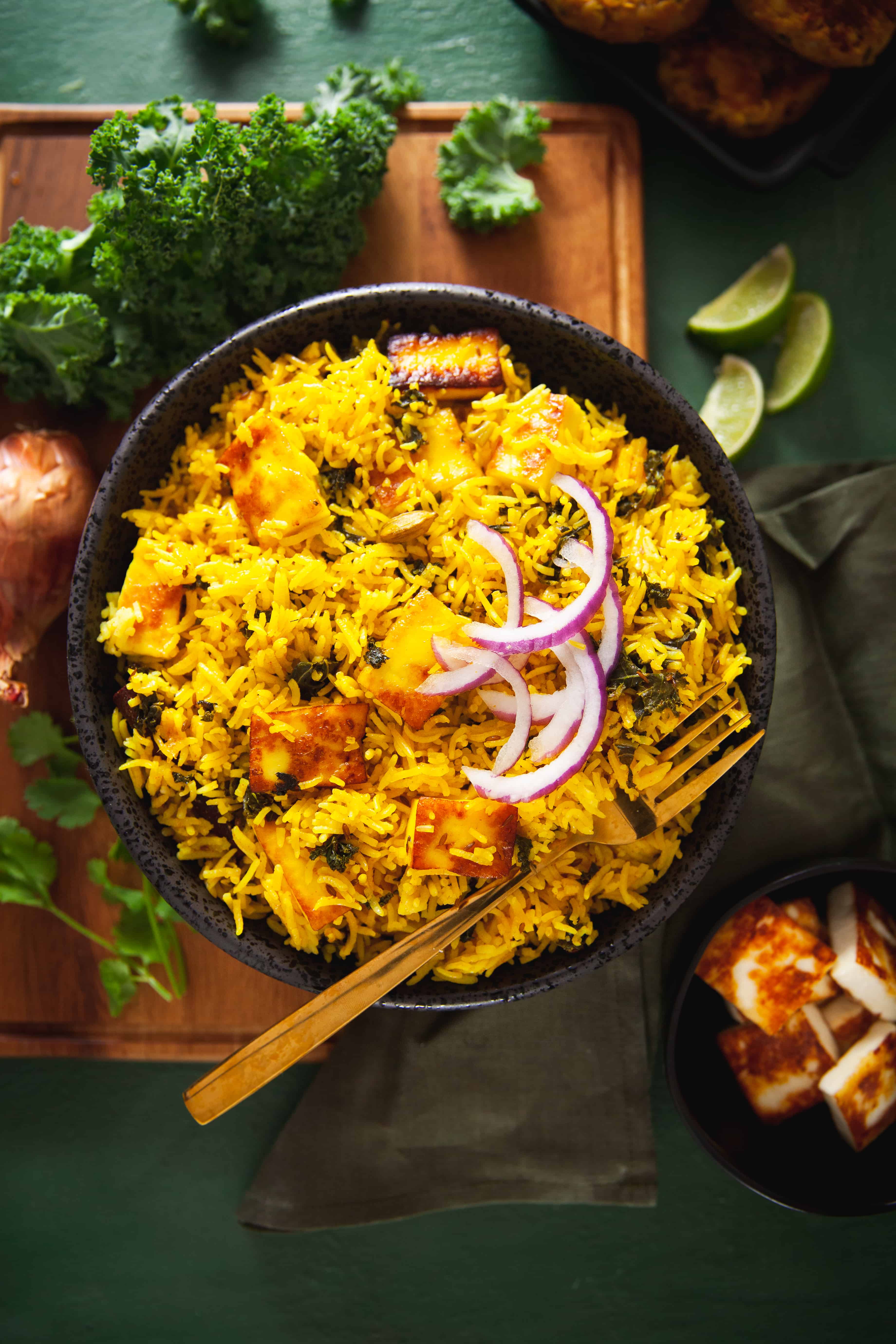 Paneer is an excellent source of protein for vegetarians and in this recipe I combine it with blanched kale - another powerhouse of nutrition. The combination of dark leafy greens, ghee crisped paneer, buttery rice and aroma of spices in each bite makes this pulao irresistible. You can add vegetables like peas, spinach or greens beans instead of kale if you wish. If you want to make it vegetarian, use tofu or any plant protein in place of paneer and skip the yogurt (finish with a little lime juice instead).