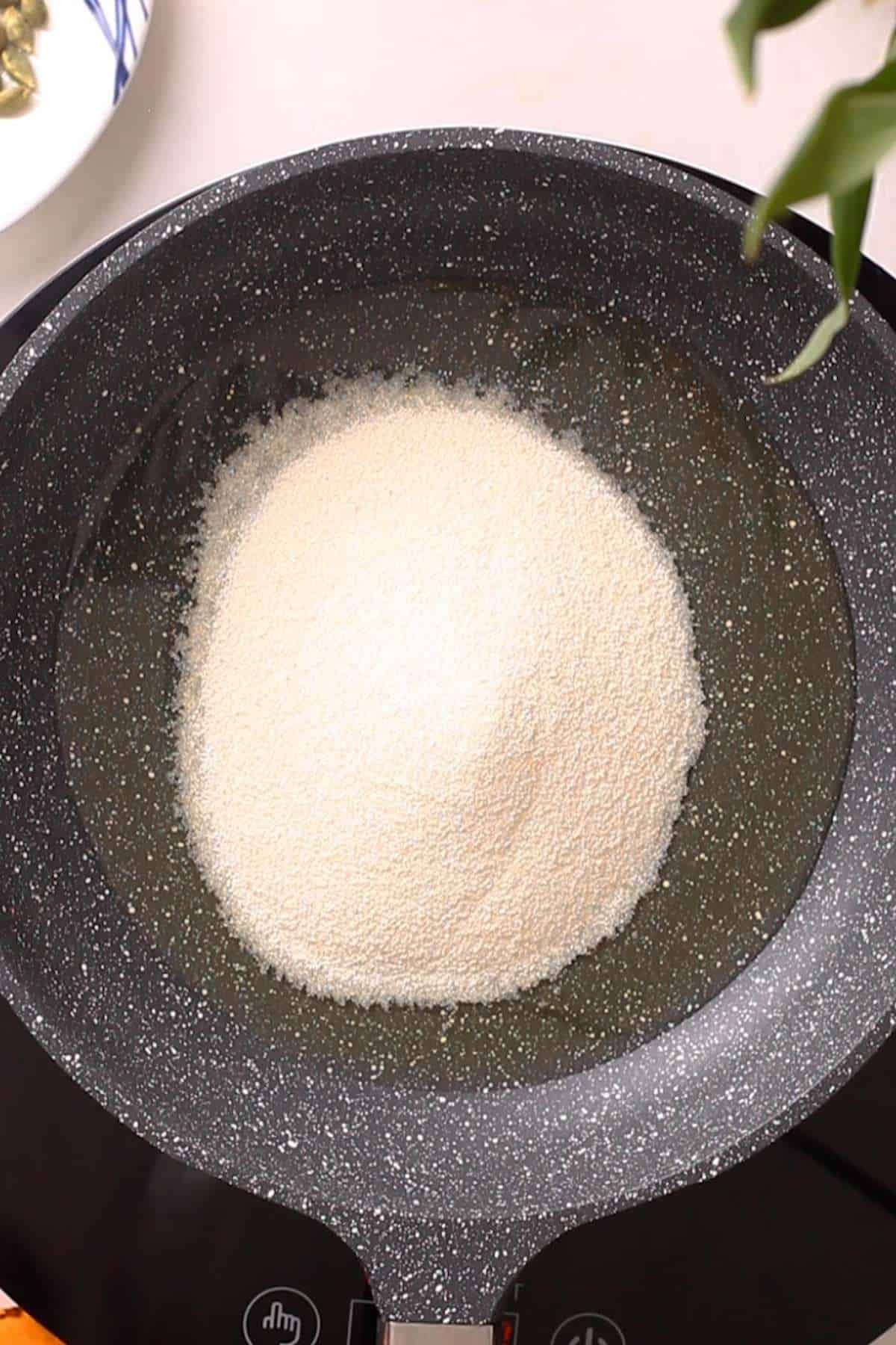- In a 10 inch pan (I prefer to use non stick), melt the ghee and add semolina to it. Toast the semolina for 8-10 minutes on low heat, stirring continuously. You dont want the color of semolina to change but it should not remain raw.