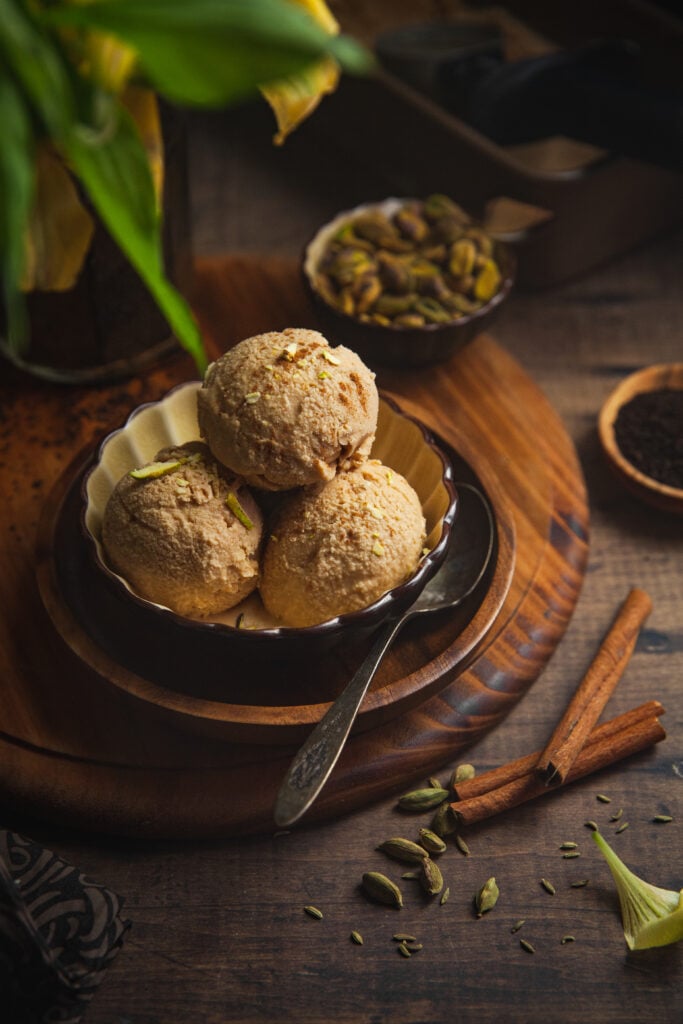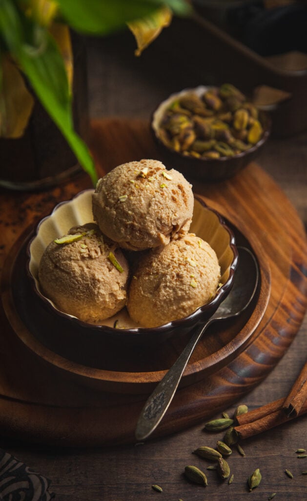 This homemade creamy ice cream tastes just like masala chai. It is super easy, needs 4-5 ingredients and is eggless! You dont need to make a custard or churn it, it comes together fast!