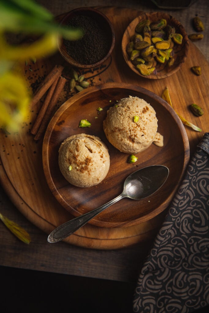 This recipe is so simple. You start by brewing some chai in half and half (or whole milk, see recipe), mix it with heavy cream, chai masala, condensed milk and freeze it overnight. Really it barely takes 20 minutes! Once frozen, scoop it out, top with some nuts if you like and enjoy!