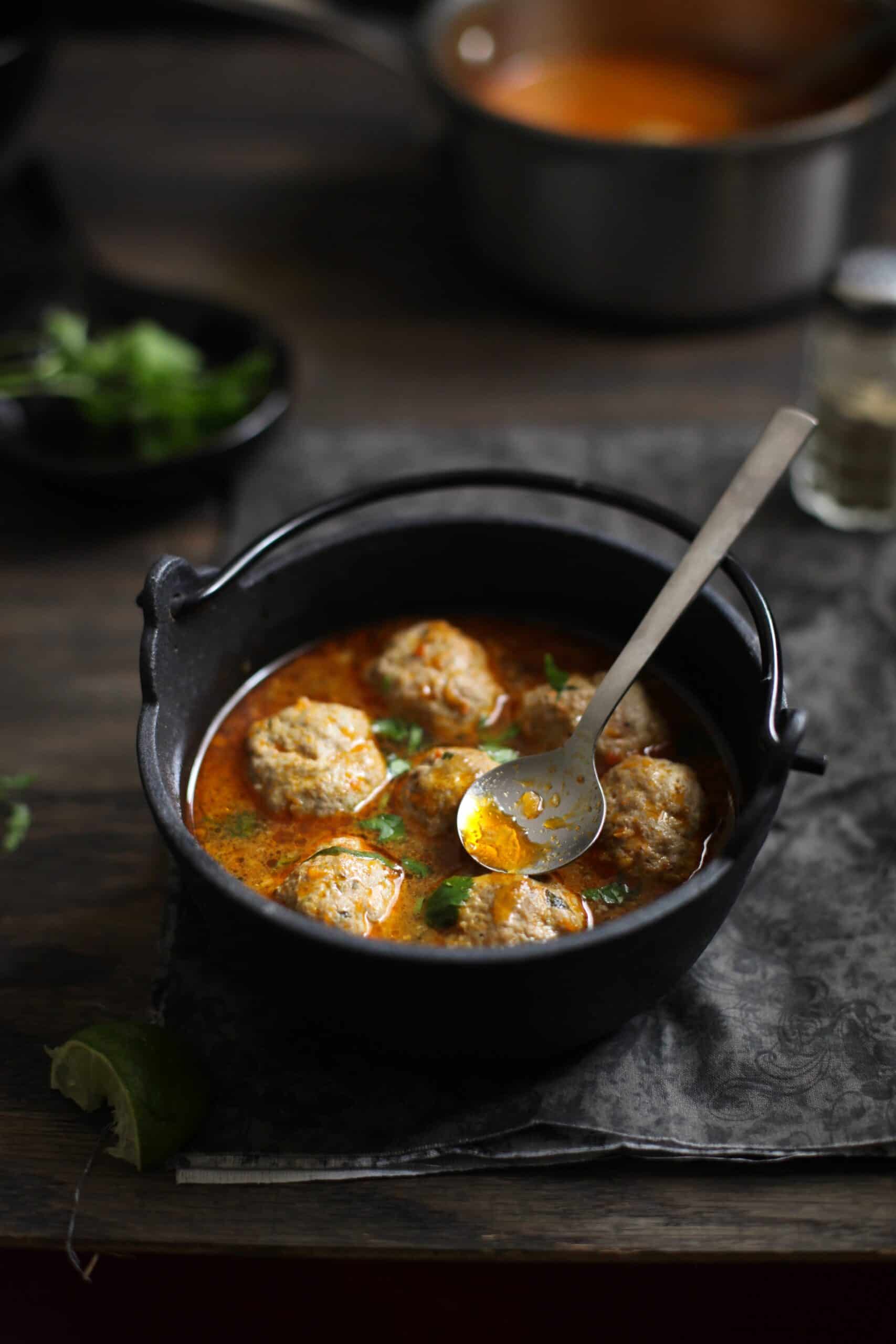 I walked back, constantly admiring the crispness around me. Sun was fading behind the cloud cover, the dullness was getting an upper hand again. Stepping inside, I quietly settled myself in the kitchen, soup was the only thing on my mind. Whenever I have a desperate longing to nestle myself in a cozy blanket slurping on a steaming bowl of broth, this meatball soup is what I resort to. Not only is it comforting but intensely flavorful. I have a particular liking for clear & brothy soups and this recipe is just that.