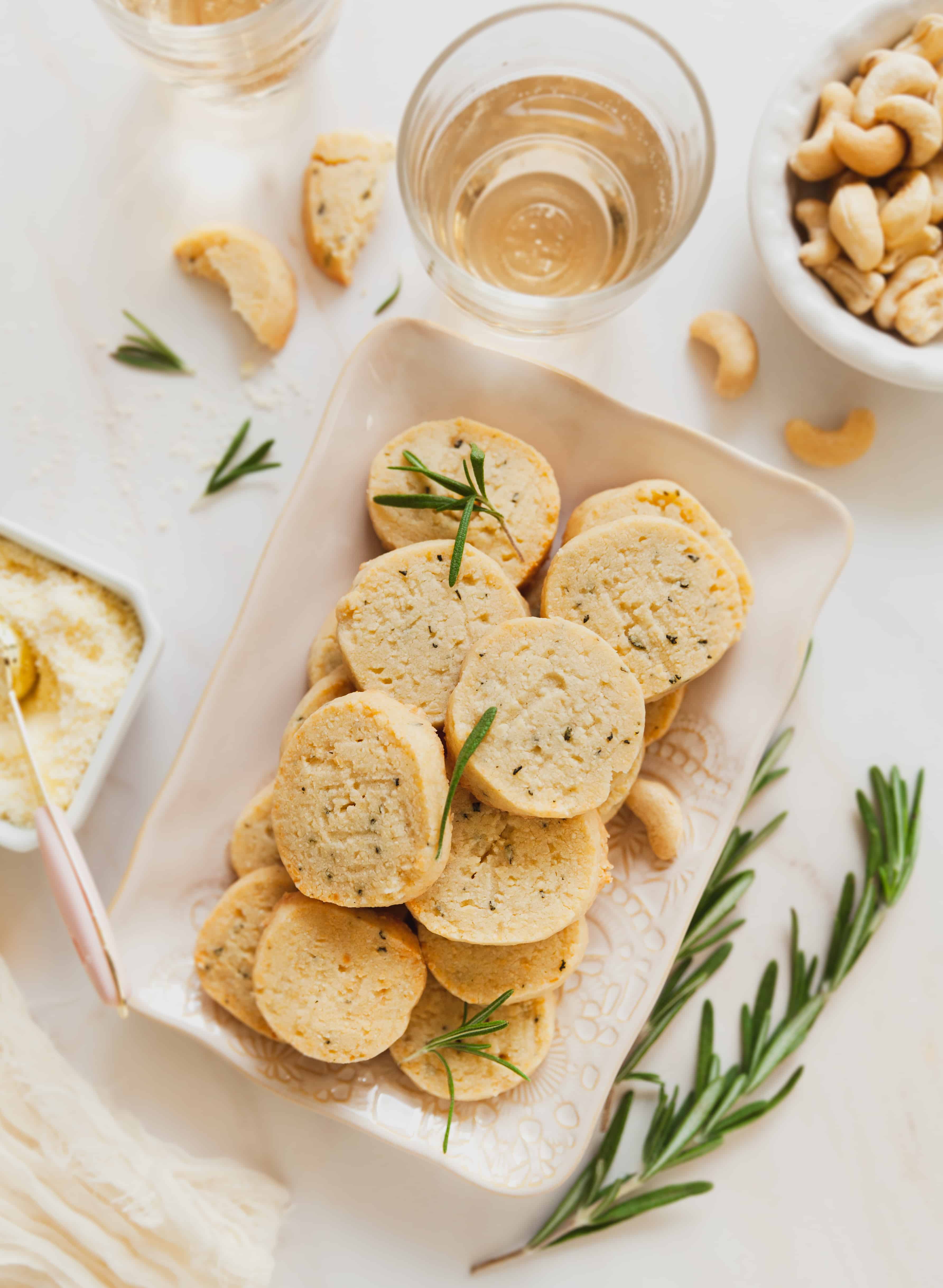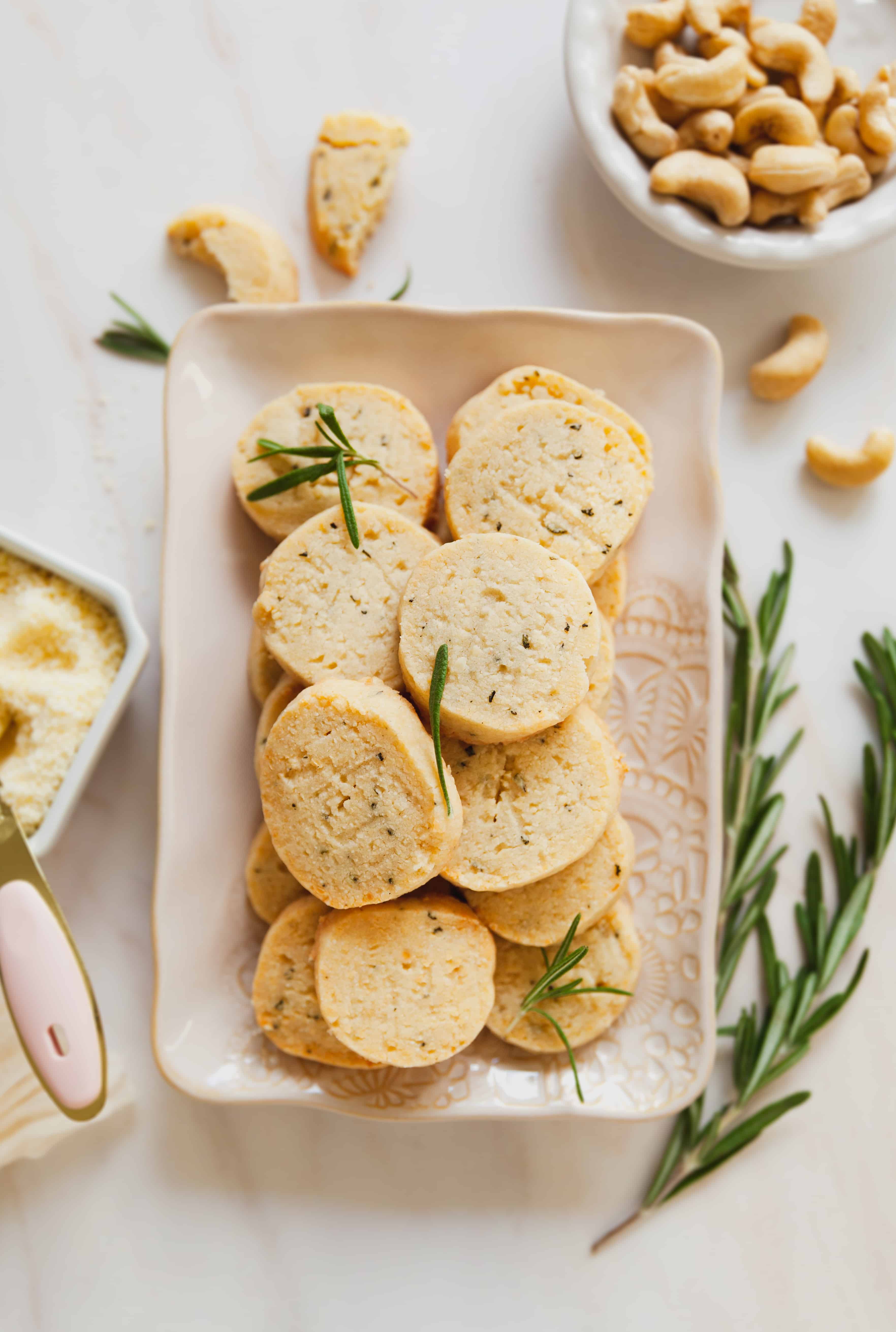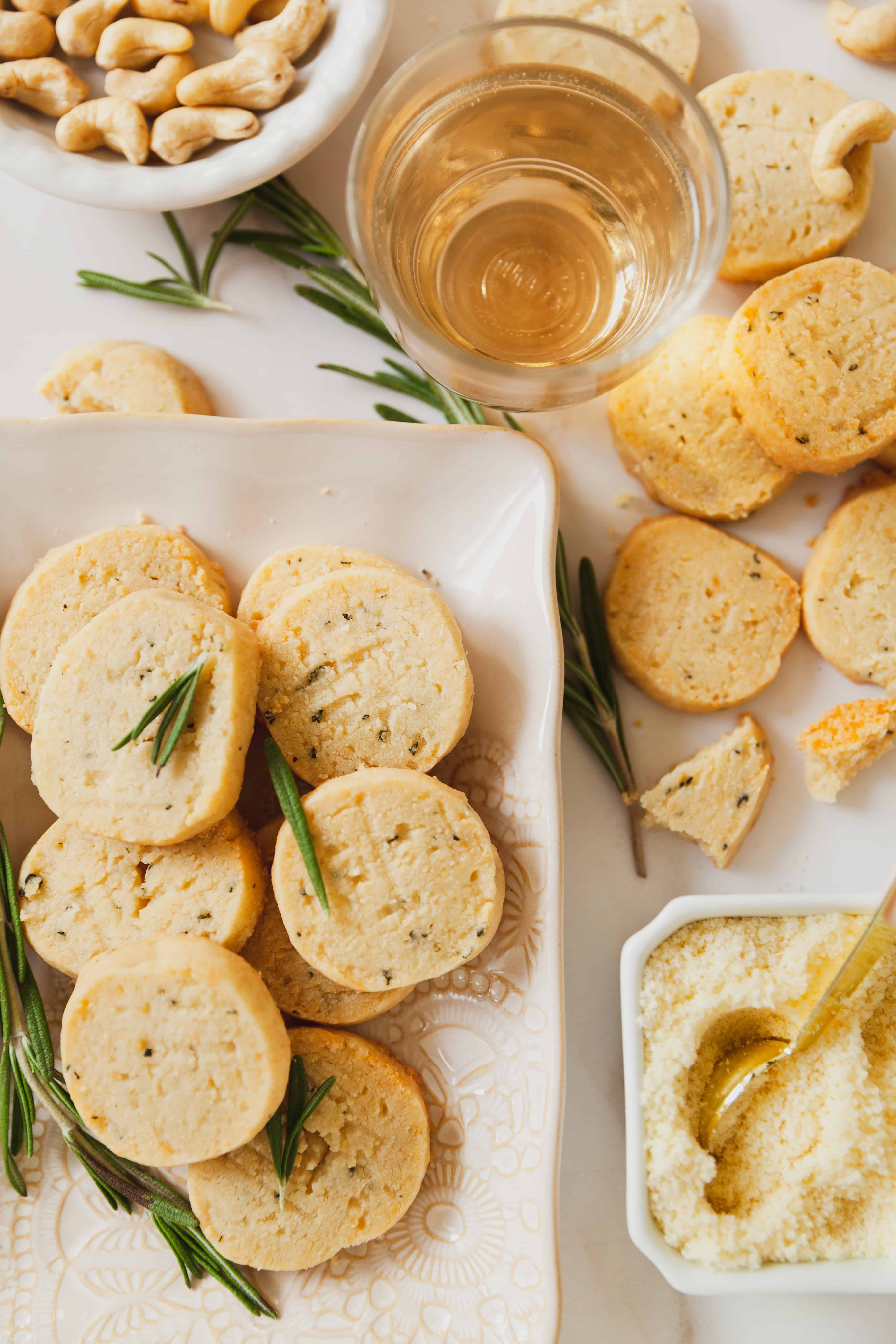 These shortbread need a handful of ingredients. Flour butter, parmesan cheese and cashews and fresh rosemary if you want to use it, however it can be skipped altogether.