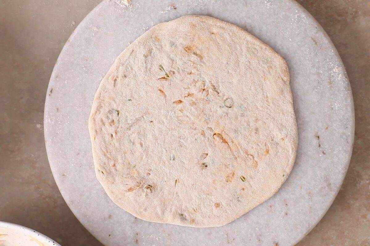 - Gently flatten this stuffed dough ball with your fingers, dust it lightly with dry flour, and begin to roll it out again. Using light, even pressure, roll it into a 6-7 inch circle. Dush lightly with dry flour as needed during rolling. Move the rolling pin gently to avoid pressing too hard, to make sure that the filling stays evenly distributed without breaking through the dough.