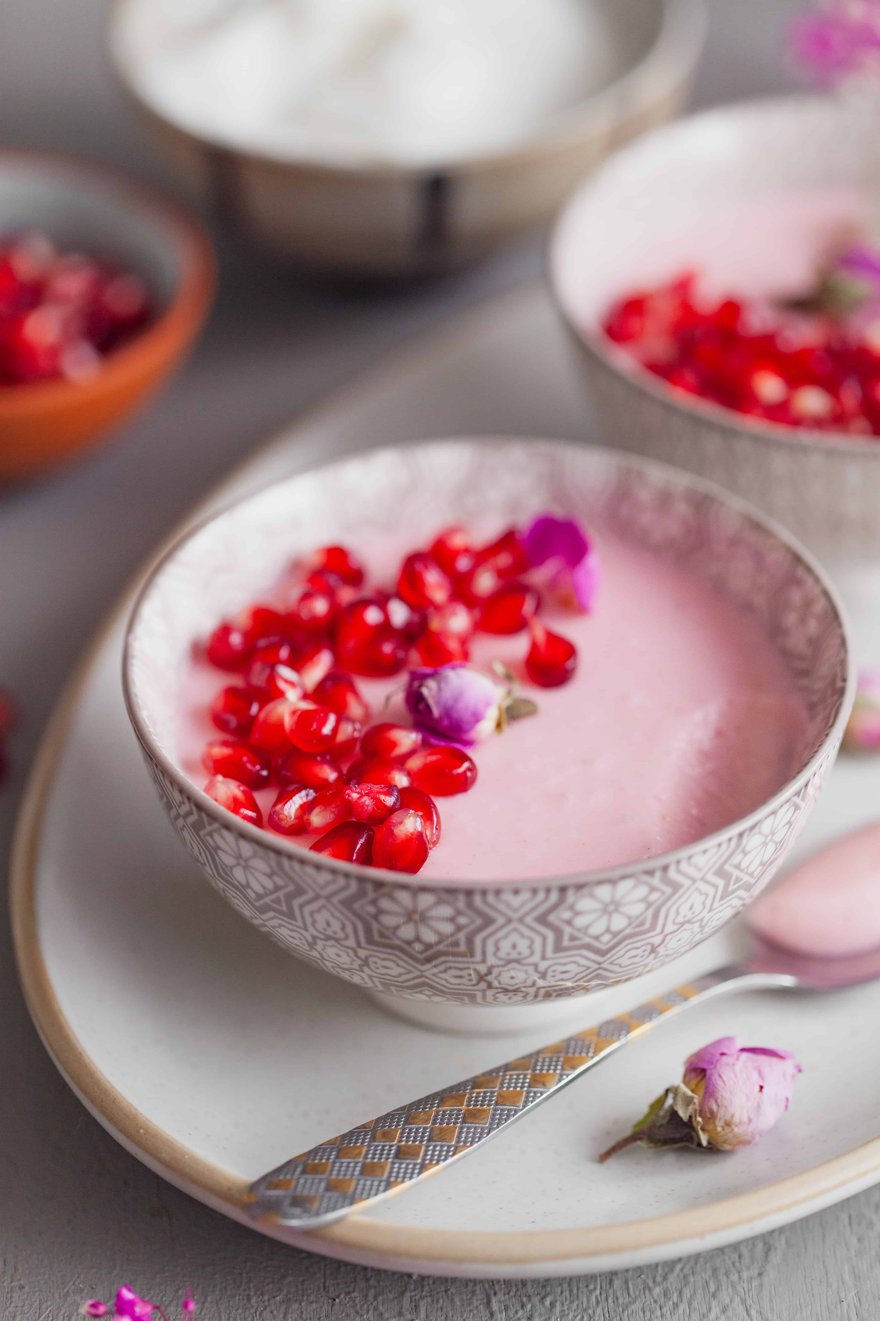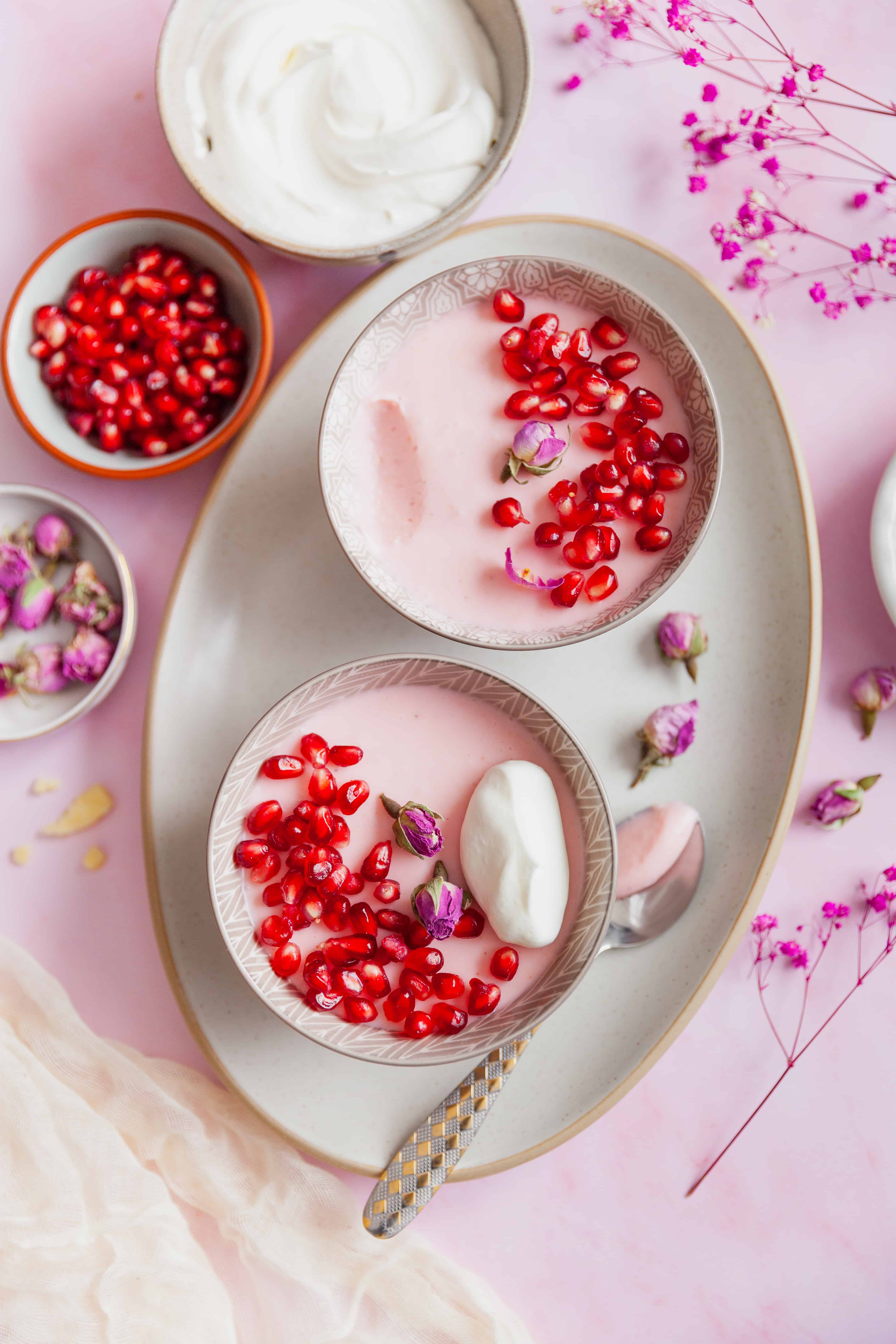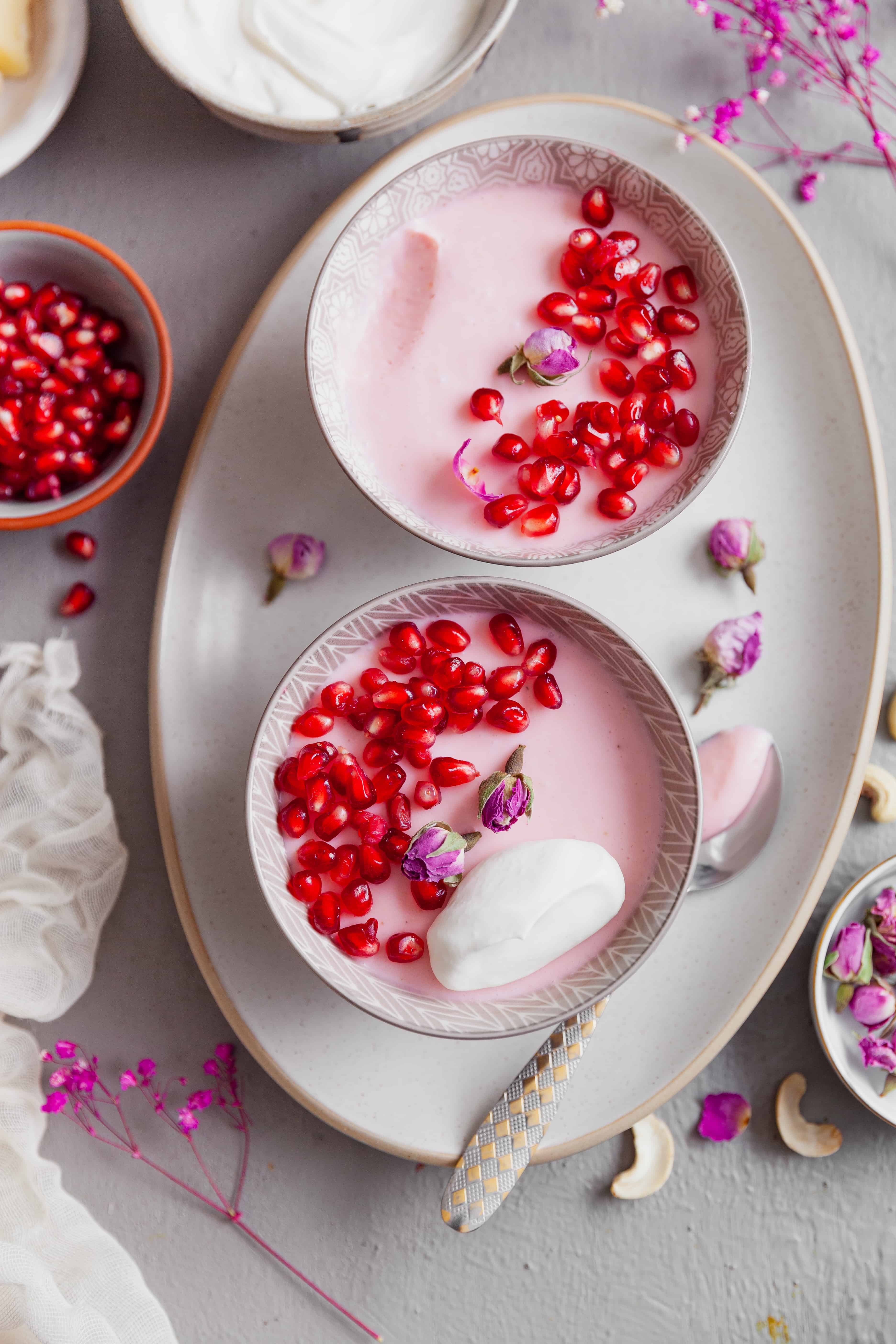 - To Garnish - Pomegranate arils, nuts, rose petals and whipped cream