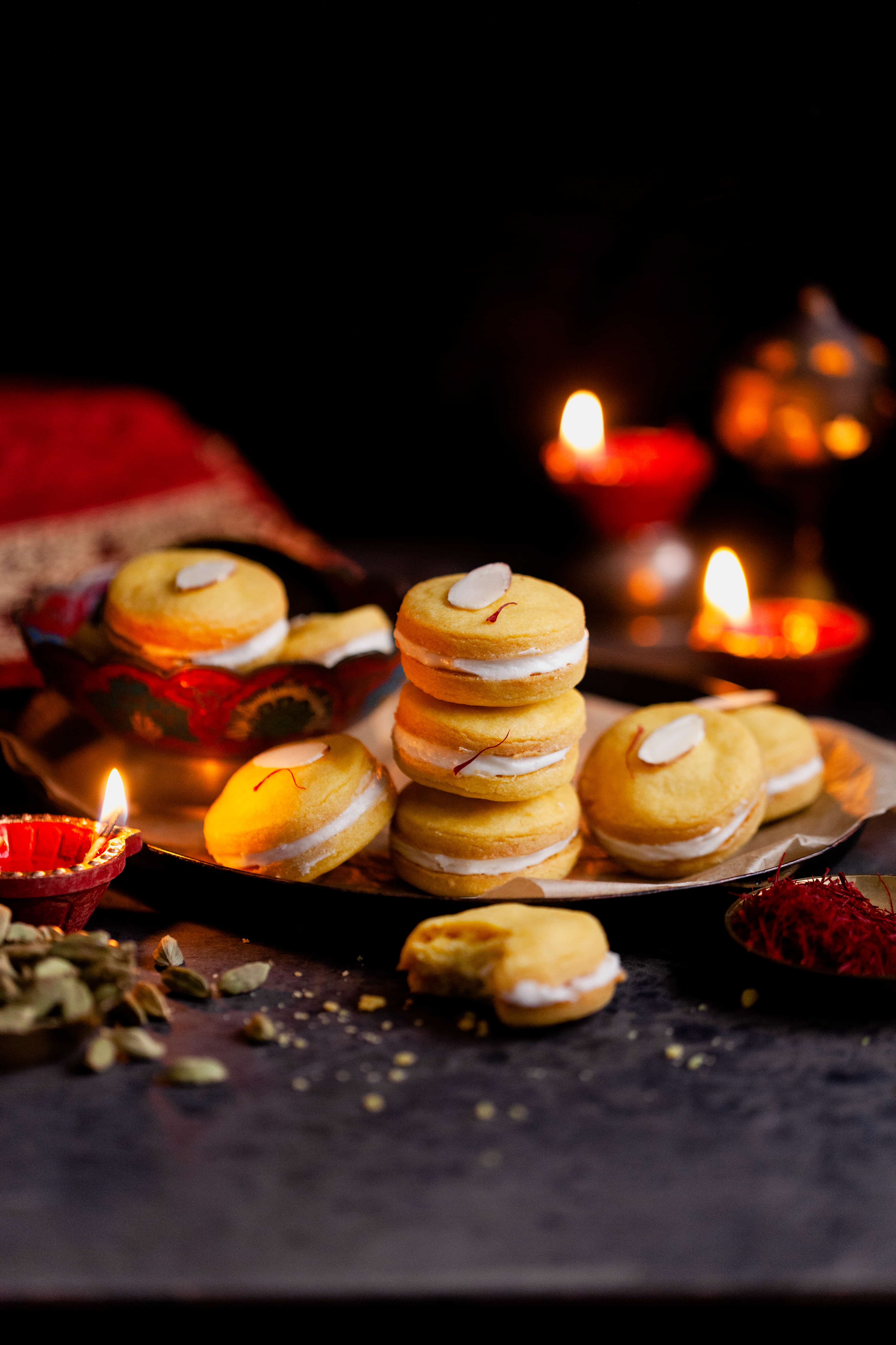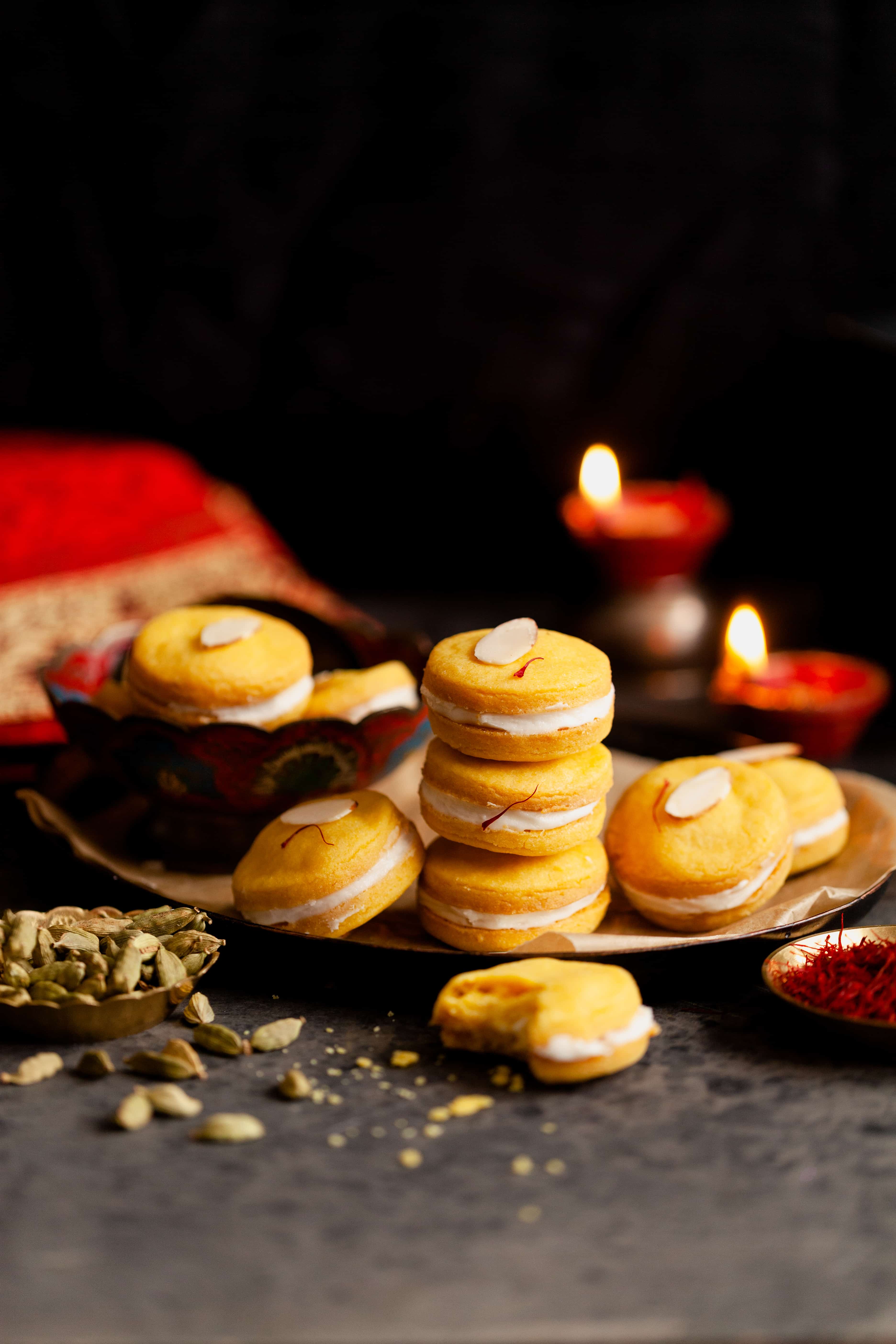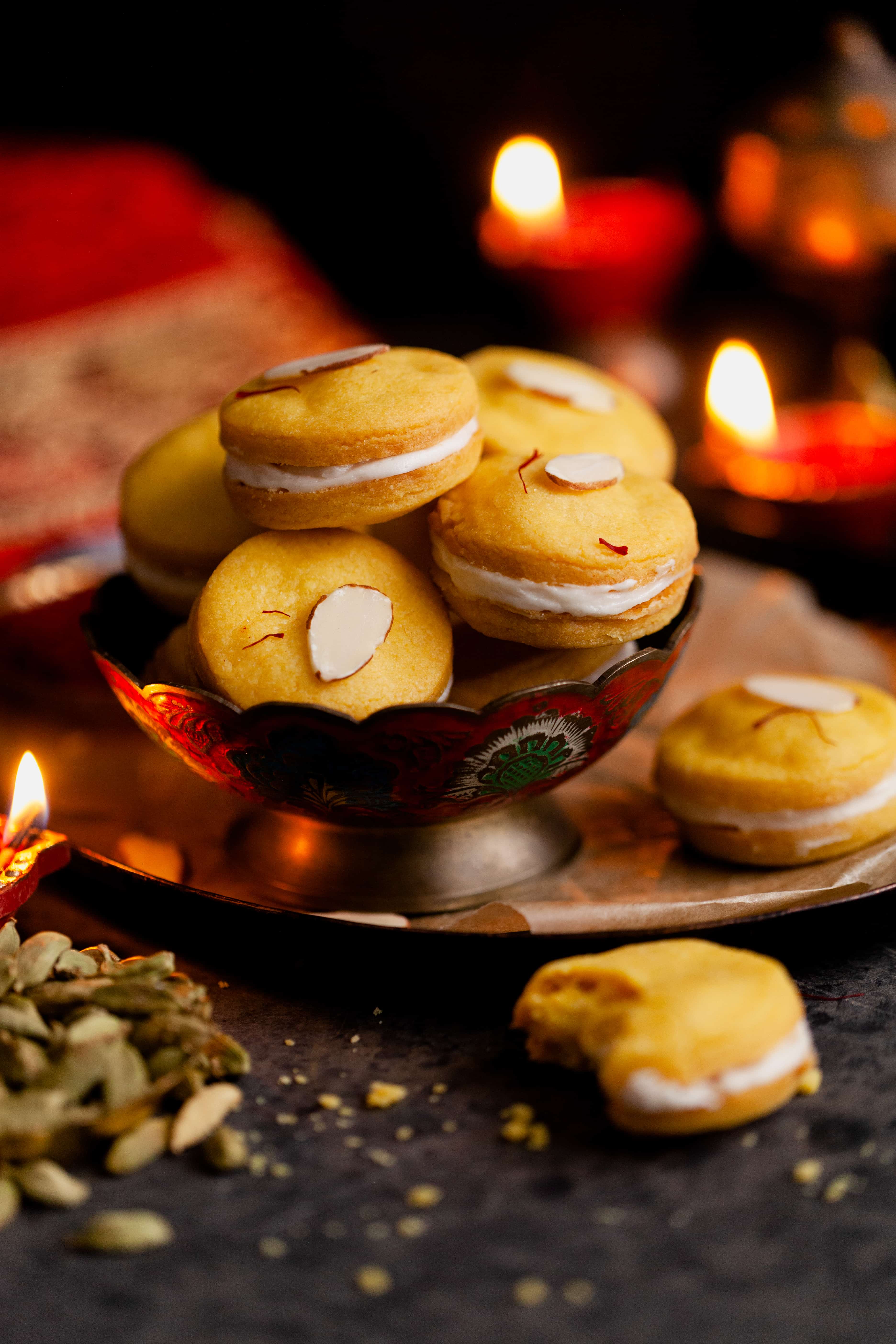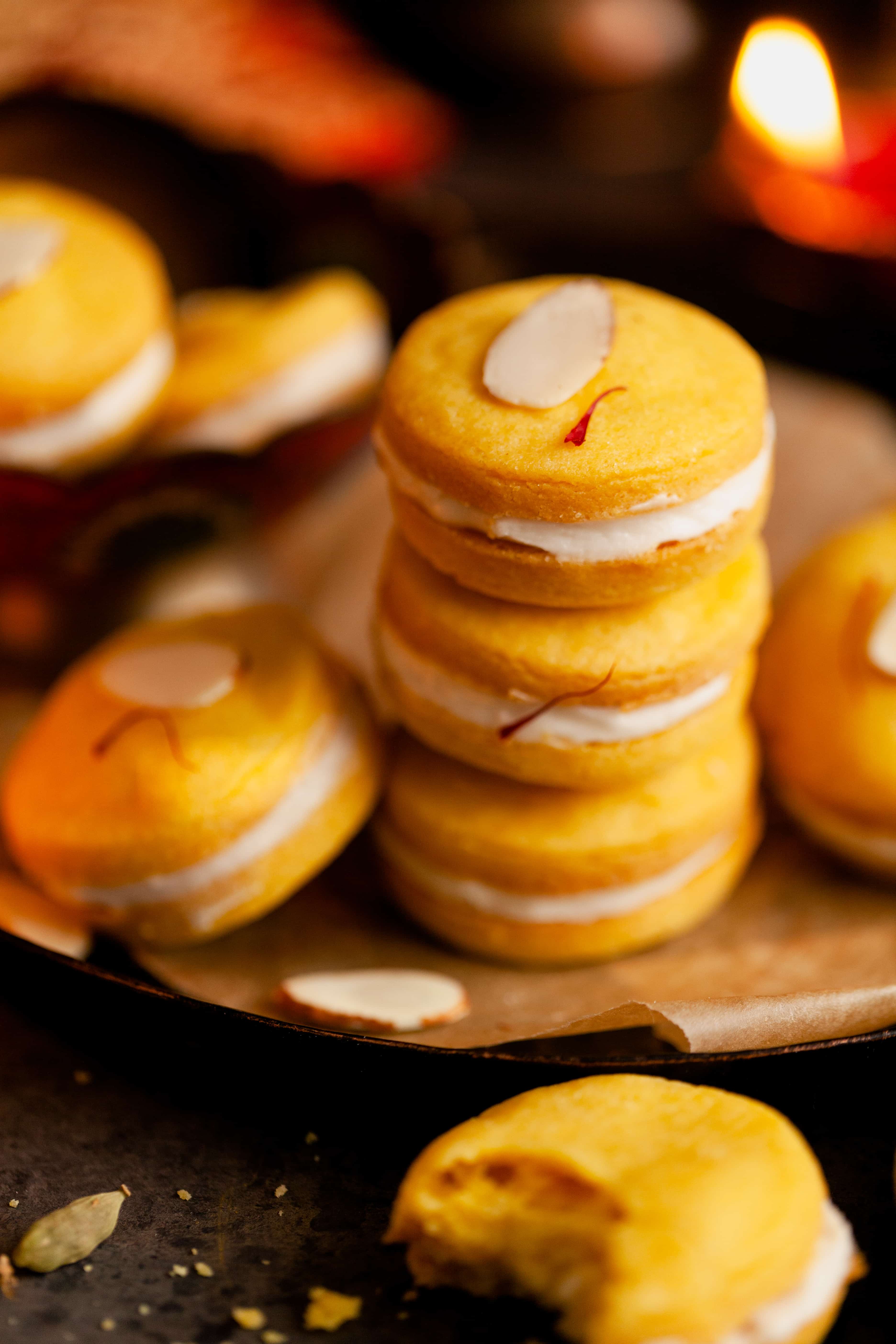 If you were to ask me about my favorite flavors of a mithai in cookie form, this is it! The eggless shortbread derives its beautiful color from saffron and the filling uses ground almonds with balmy green cardamom. They are moreish, buttery bites.