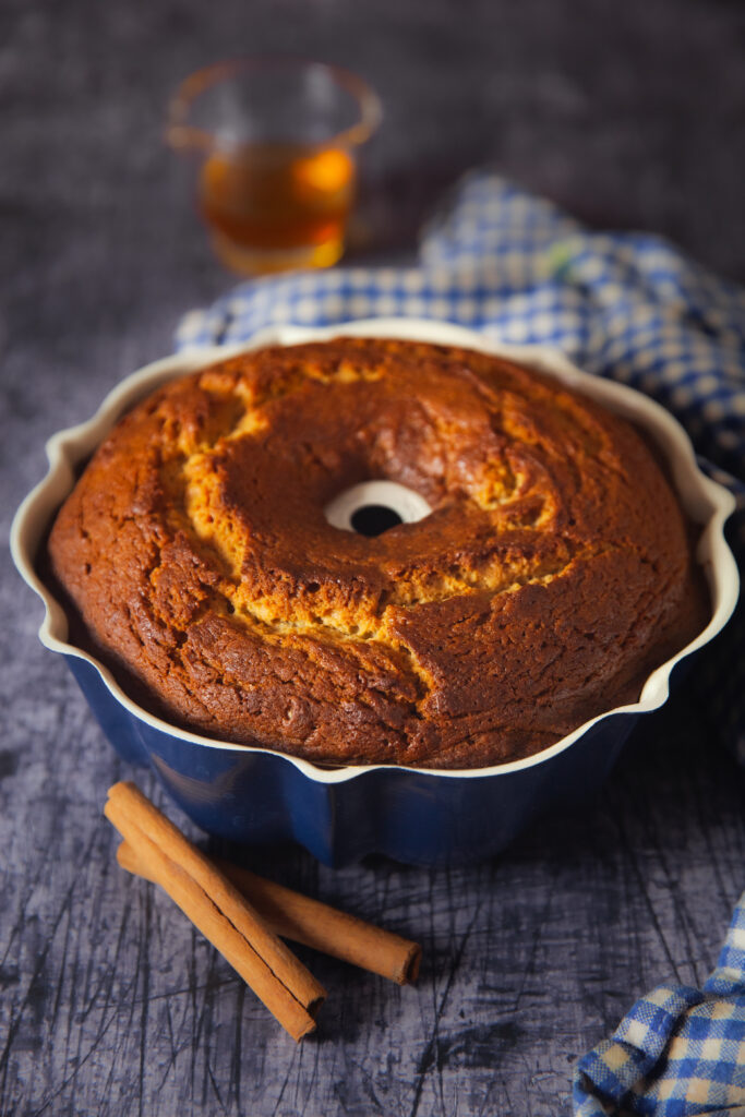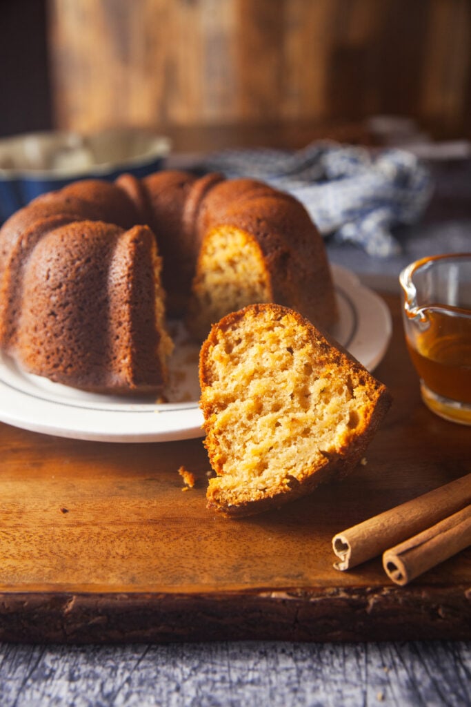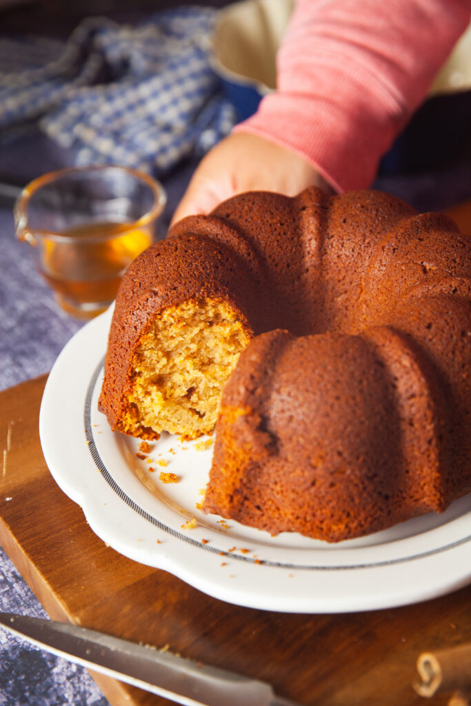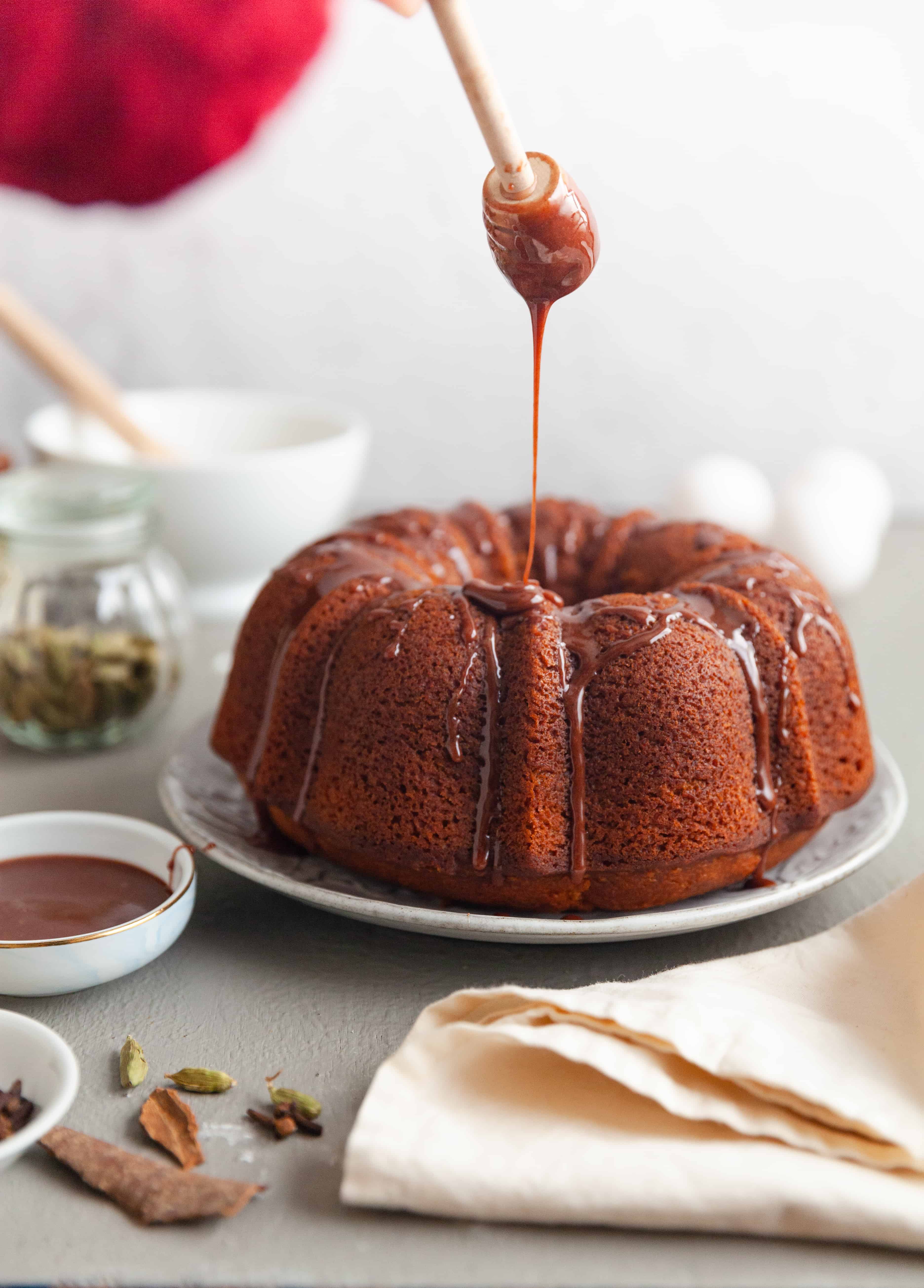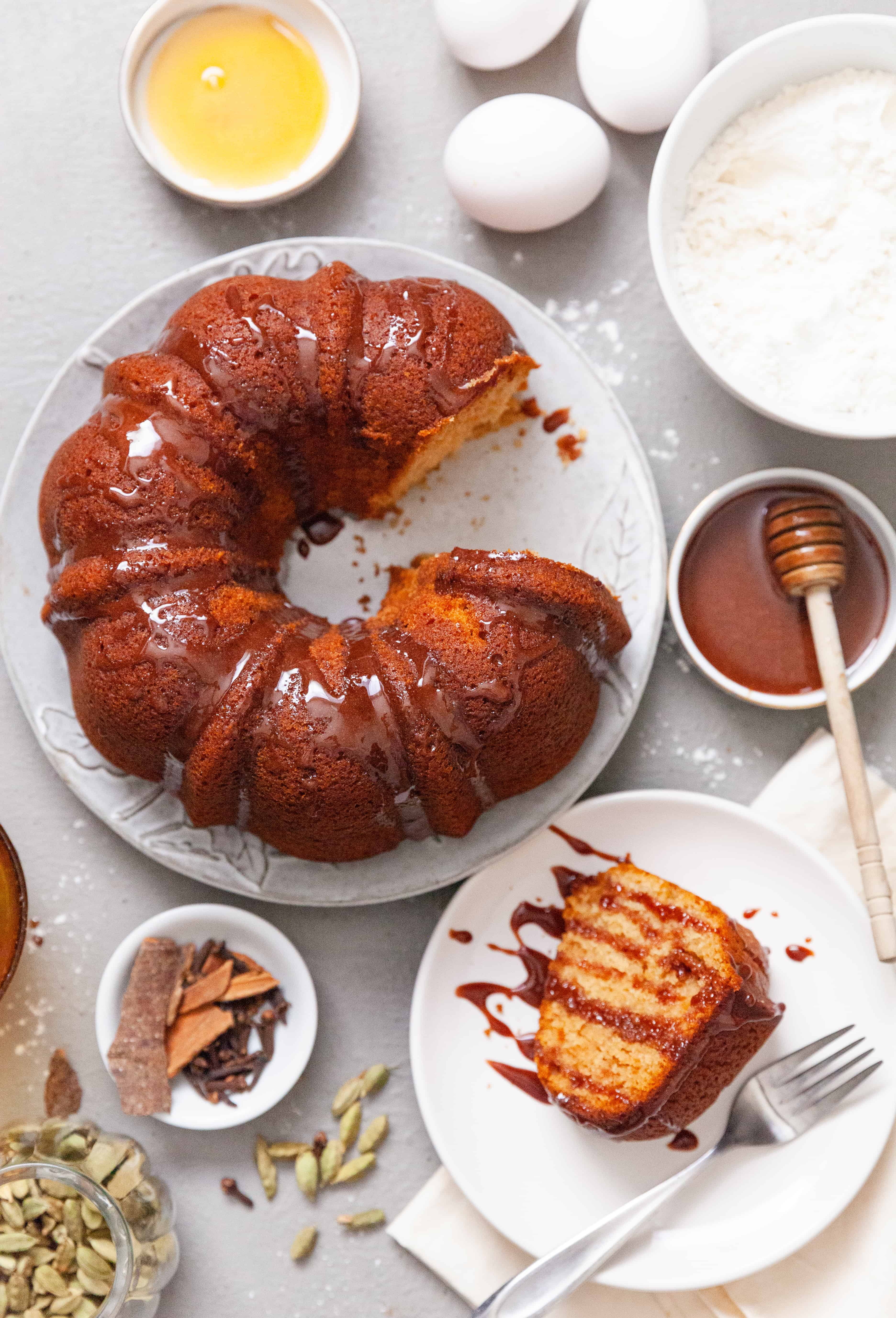 Bundt cake pan is suitable for baking dense moist cakes and this cake falls in the same category. The cake batter is on the runnier side and the hole in the middle of the cake pan allows air and heat to rise through the center of the cake. This helps in even cooking. Due to all the moisture in the cake batter from honey, yogurt, and eggs, if you try to bake this cake in a round cake pan, it will not cook properly in the center and might burn at the edges.