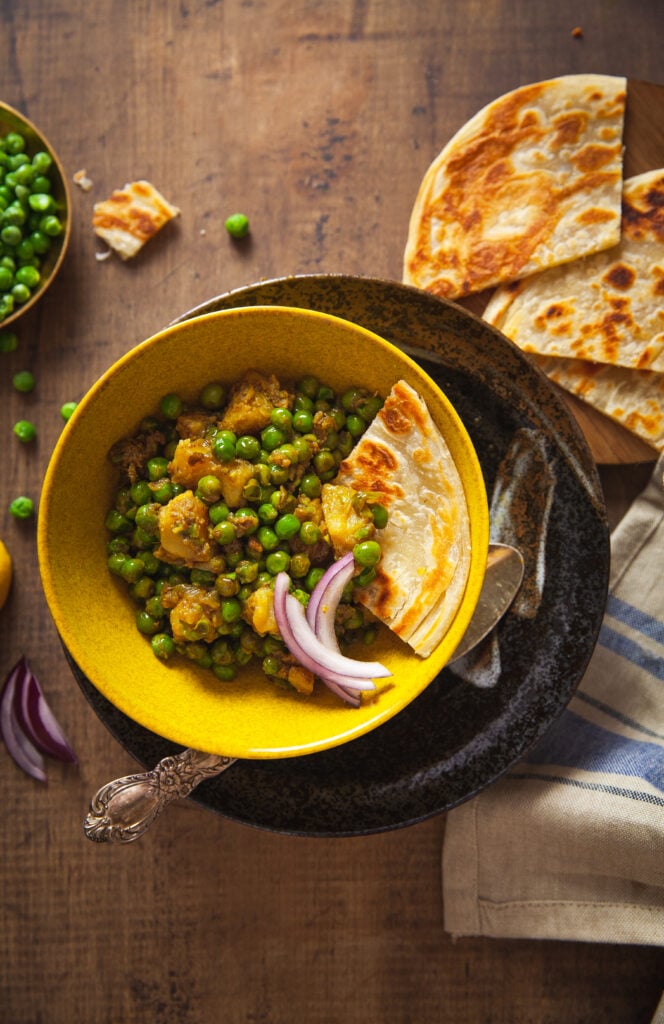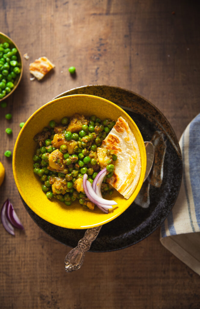 Aloo(potatoes) and matar(fresh peas) is a classic combination in North Indian cuisine. Be it the curry made with these two vegetables or this dry sabzi, it makes for a delicious meal anytime. Indian homestyle food is much simpler than the 5-6 stereotype dishes which define the cuisine outside of the country. Everyday food does not need a long list of ingredients and the taste is familiar of home. Like this sabzi, which was packed in our lunch boxes with paratha and a knob of aam ka achar. Or served for dinners accompanying a pile of warm daal and chawal.