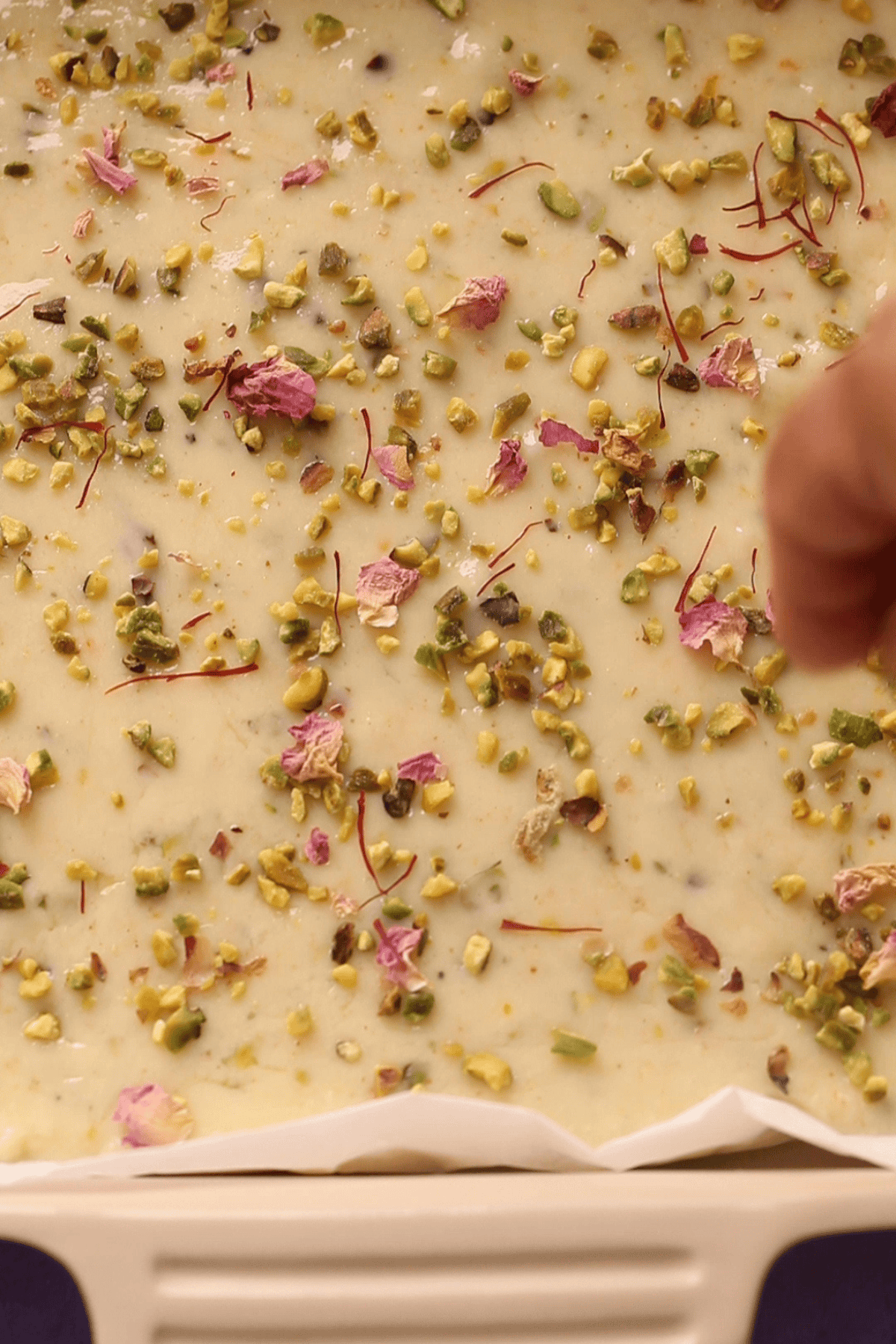 - Step 4: Pour the mixture into the prepared pan and spread it evenly with a spatula. Sprinkle rose petals, pistachios, and saffron strands on top, gently pressing them into the fudge.